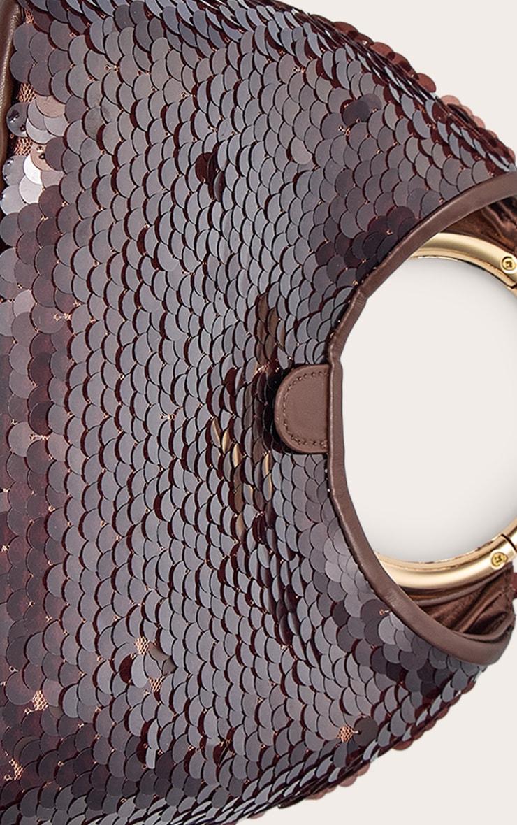 Make your mark after dark with a piece designed to truly captivate. The chocolate sequin grab handle clutch bag delivers an undeniable shimmer, entirely adorned with rich chocolate-hued sequins that catch every light. Its distinct, sculptural gold-toned circular grab handle offers a refined carrying option, completing a knowing evening aesthetic. Pair this standout accessory with a sleek black midi dress or sharply tailored pants, ensuring your look is elevated with elegant black kitten heels. Add a stack of polished gold bracelets to echo the handle's finish, curating an ensemble that speaks volumes without uttering a word.p]:!mb-4inch>Brand: PrettyLittleThingCategory: AccessoriesProduct type: ClutchColor: ChocolateMaterial: SequinOccasion: Evening