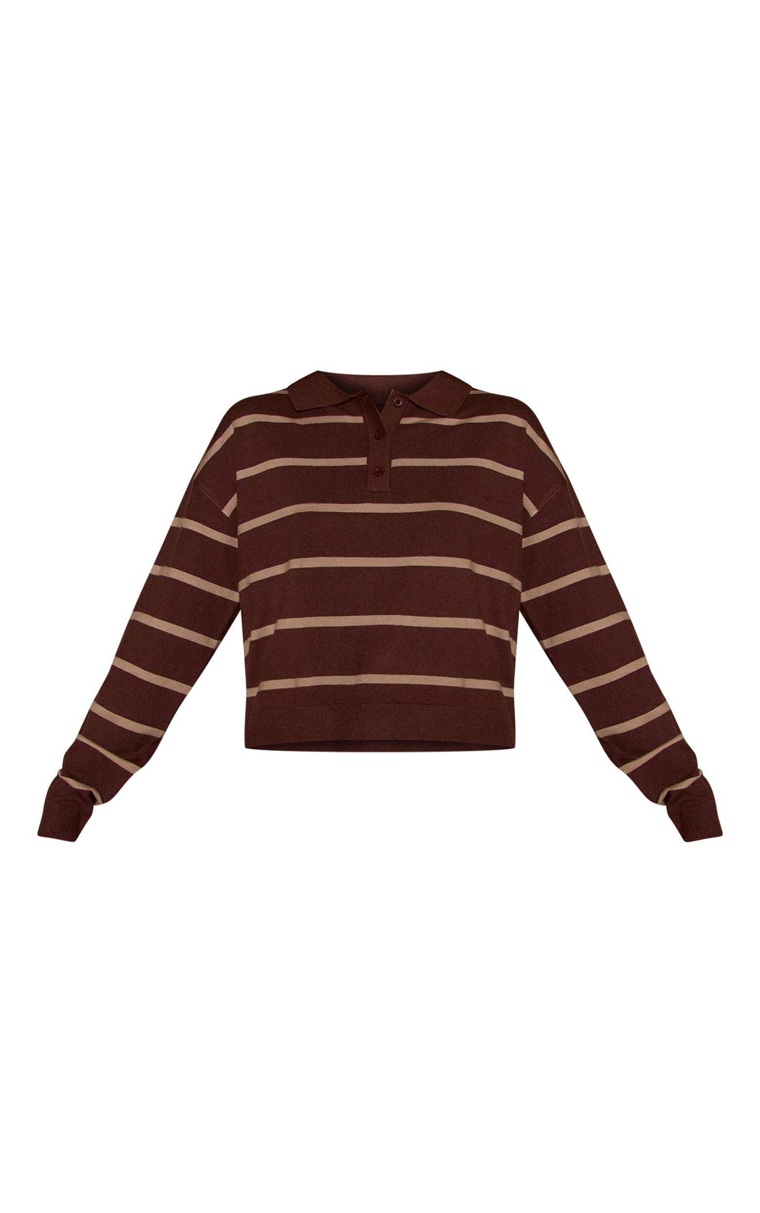 Refresh your knitwear with this chocolate stripe polo knit long sleeve rugby top. Designed with stripe detailing and a structured collar for a smart-casual feel. Style with denim or tailored bottoms.Length approx 48.5cm/19inch (Based on sample size S)Model wears size SModel Height - 5ft 7inchp]:!mb-4inch>Brand: PrettyLittleThingCategory: KnitwearProduct type: T-ShirtColor: ChocolateMaterial: KnitOccasion: Day