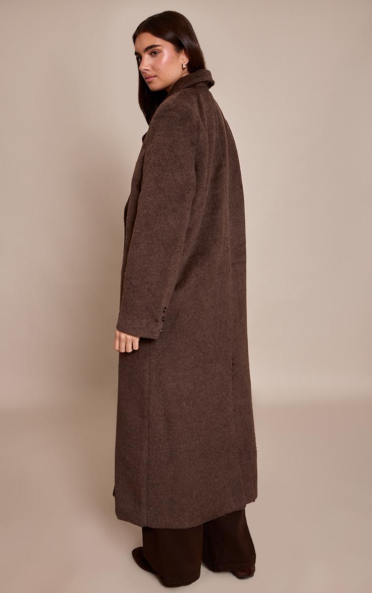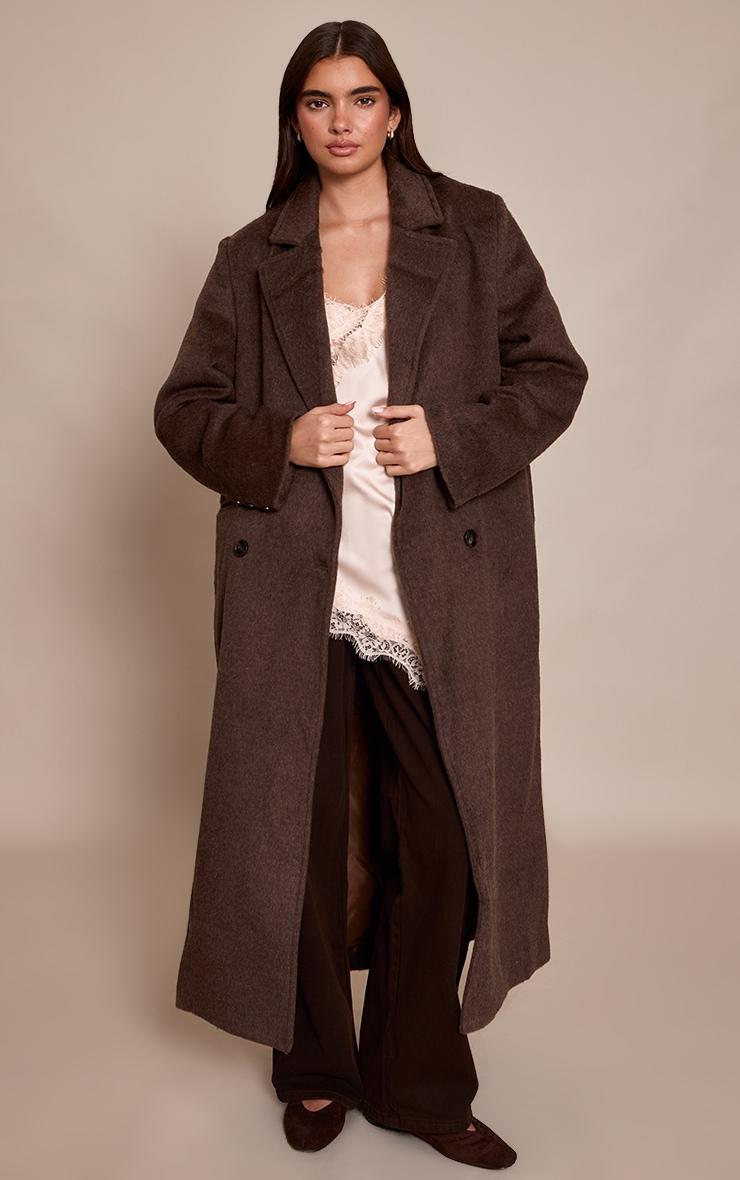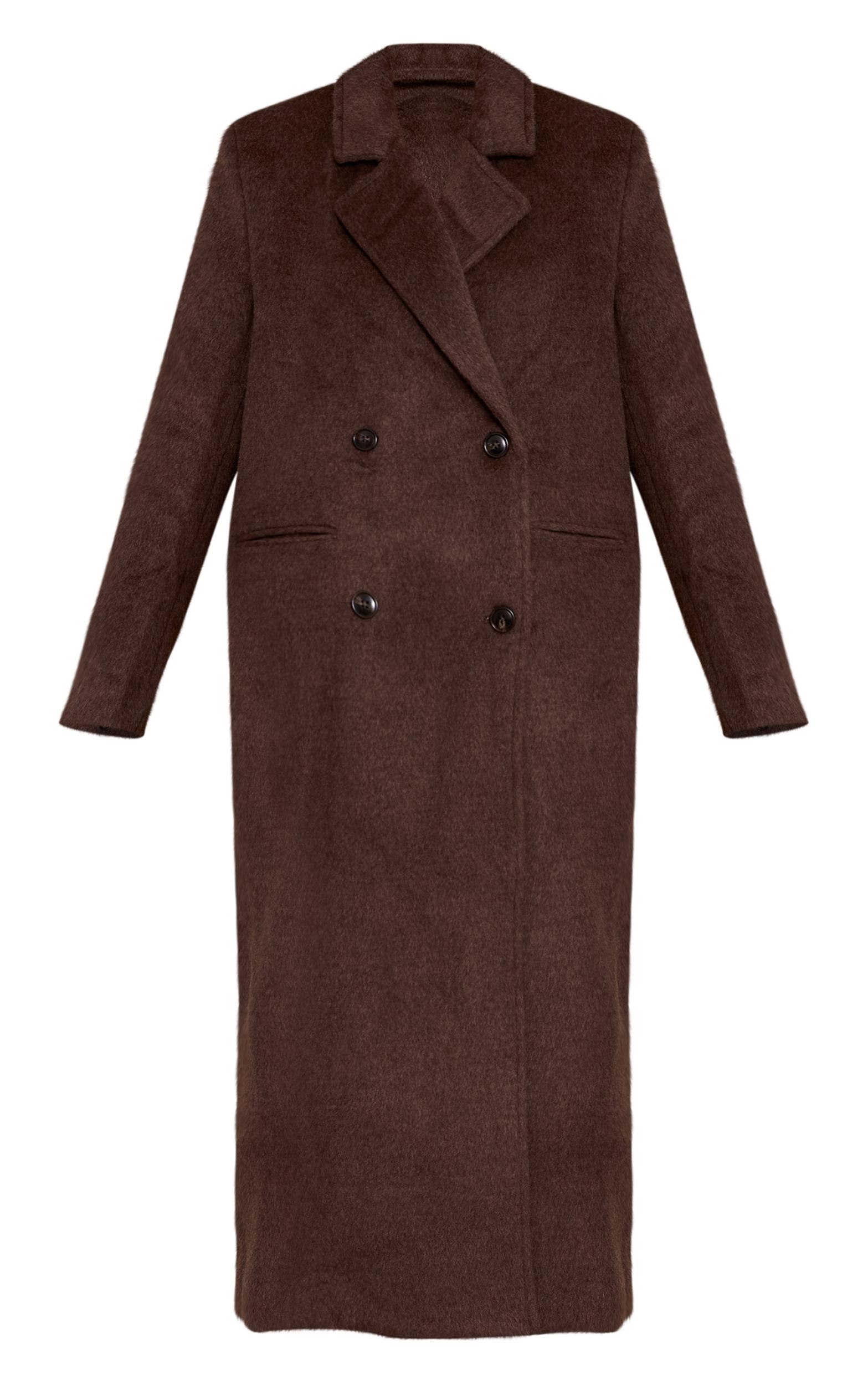 The chocolate structured double breasted wool look maxi coat is timeless and tailored, offering a sleek silhouette and elegant length. Style it with leather boots and a turtleneck for a polished winter look, or layer over a midi dress for effortless sophistication.Length approx 134.5cm/53inch (Based on sample size S)Model wears size SModel Height - 5ft 8inchp]:!mb-4inch>Brand: PrettyLittleThingCategory: OuterwearProduct type: Wool Look CoatColor: ChocolateMaterial: Faux WoolOccasion: Day