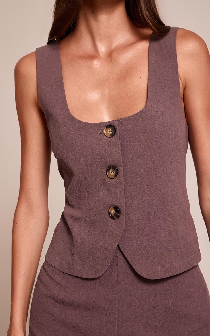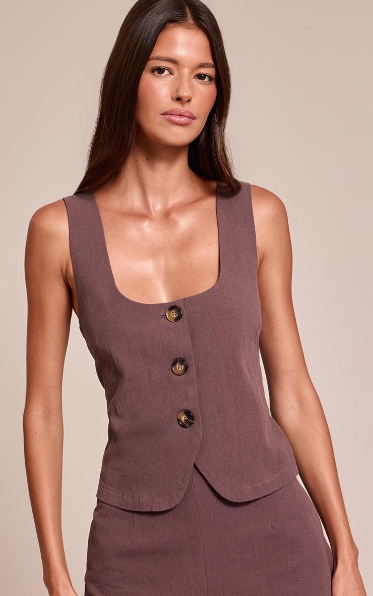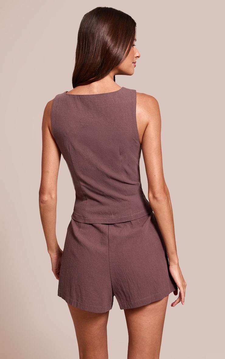 Embrace an understated edge for your daily rotation. The chocolate texture button down waist coat offers a confident take on the romper, featuring a sophisticated wide scoop neckline and a neat trio of brown buttons down the front. Its sleeveless cut and subtle curved hem create a modern silhouette that's perfect for warm days. Complete this versatile piece with chunky sneakers and a minimalist tote bag for an effortless, on-the-go look that's all about contemporary cool.Length approx 81.5cm/32inch (Based on sample size US 4)Model wears size UK 8/ EU 36/ AUS 8/ US 4Model Height - 5ft 7inchp]:!mb-4inch>Category: DressesProduct type: Tailored PlaysuitColor: ChocolateMaterial: Textured JerseyOccasion: Day