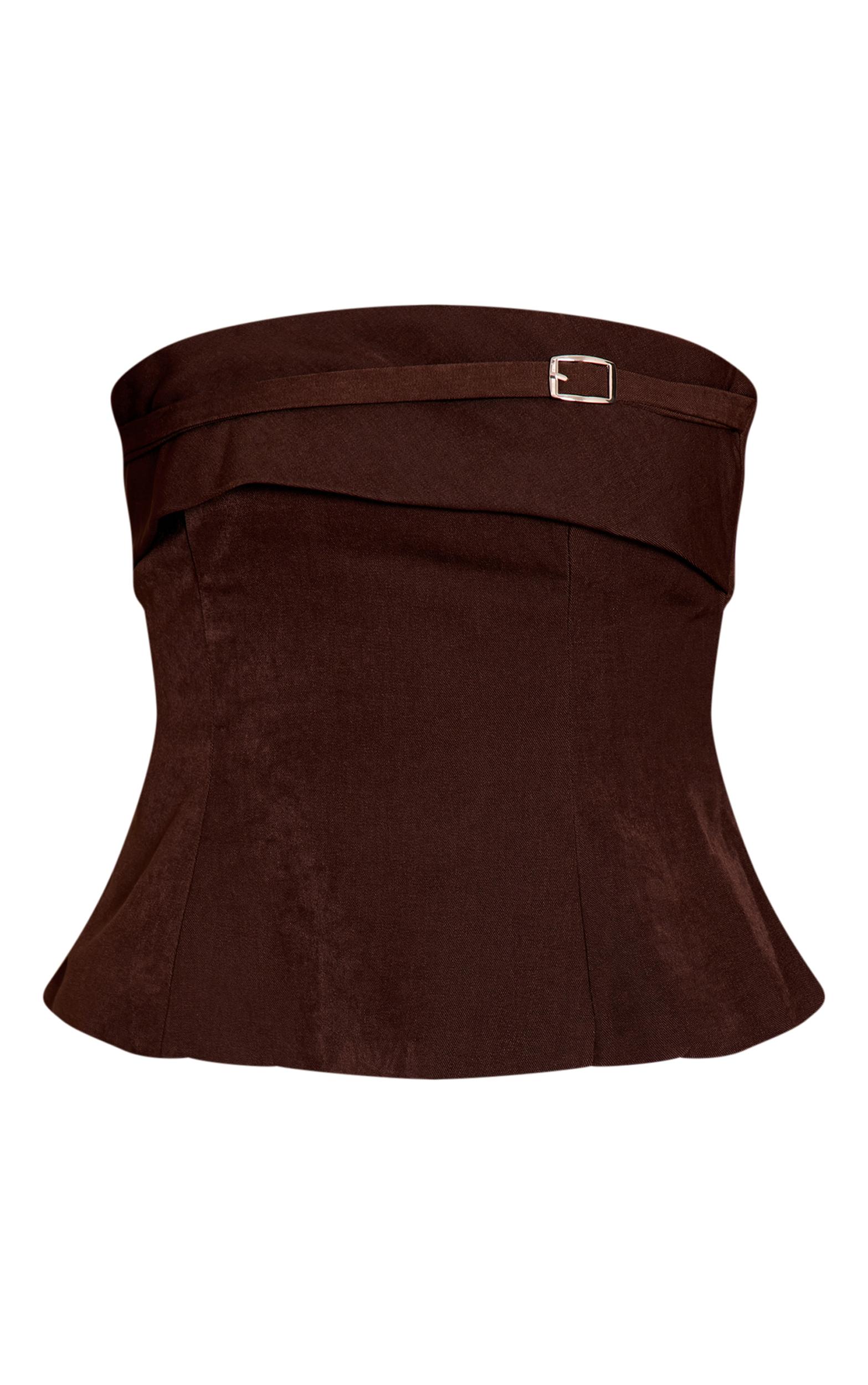 Add a chic twist with the chocolate woven fold over buckle detail bandeau. Crafted from woven fabric, it features a fold over design and statement buckle detail for a modern feel. Pair with tailored pants and a pair of kitten heels for a sleek evening outfit.Length approx 34.5cm/13.5inch (Based on sample size US 4)Model wears size UK 8/ EU 36/ AUS 8/ US 4Model Height - 5ft 9inchp]:!mb-4inch>Category: TopsProduct type: Bandeau TopColor: ChocolateMaterial: Woven CrepeDesign: PlainNeckline: BandeauSleeves: BandeauOccasion: Evening