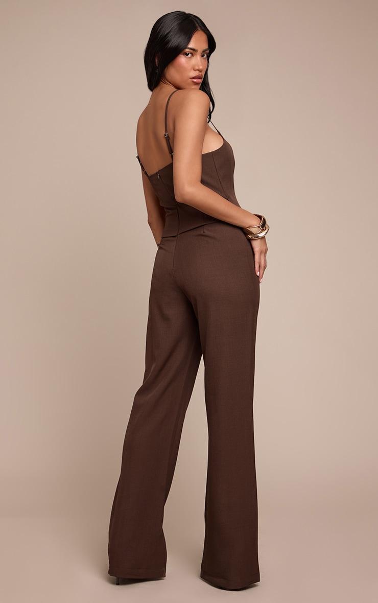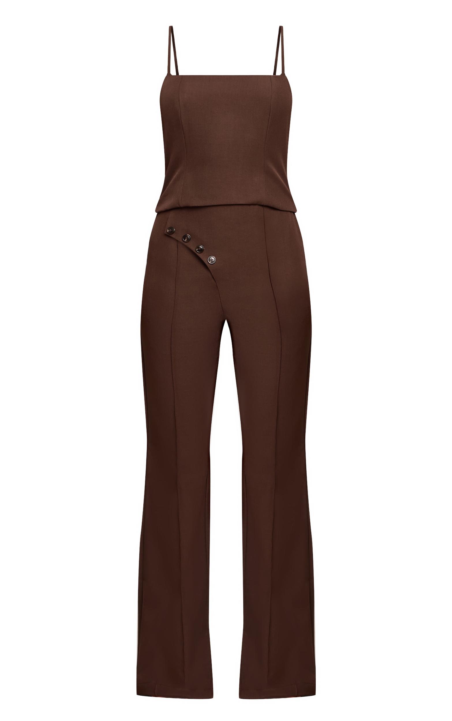 Make an entrance in this chocolate woven tailored button detail straight leg jumpsuit. Its chocolate woven material shapes a sharp tailored fit with a square neckline and button details. Perfect for chic evening plans. Style with brown heels and minimal stud earrings.Length approx 155cm/61inch (Based on sample size US 4)Model wears size UK 8/ EU 36/ AUS 8/ US 4Model Height - 5ft 6inchp]:!mb-4inch>Brand: PrettyLittleThingCategory: DressesProduct type: Wide Leg JumpsuitColor: ChocolateMaterial: Slinky JerseyOccasion: Evening