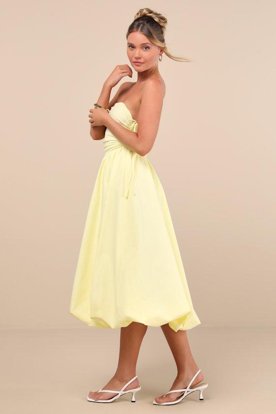 You'll be manifesting major sunshine energy with this spring-ready dress, featuring a ribbed knit bodice with a strapless design and cinching drawstring tying details along the the sides. A breezy woven poplin skirt boasts an A-line silhouette and a bubble-style midi hem, completing the stroll-worthy look.