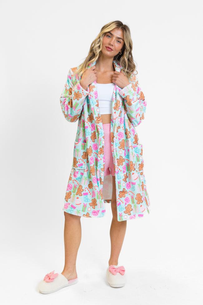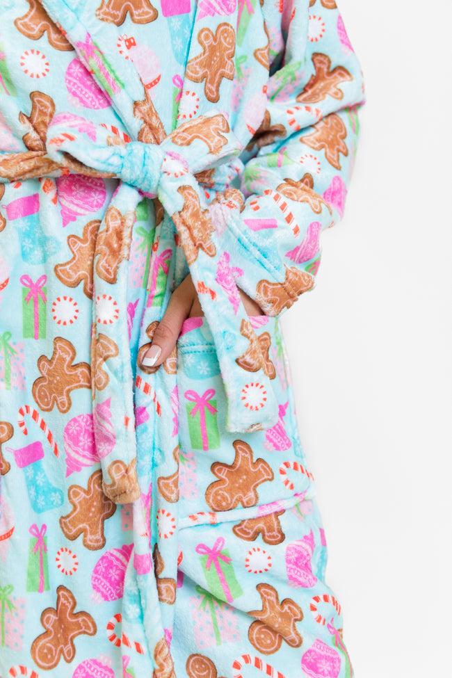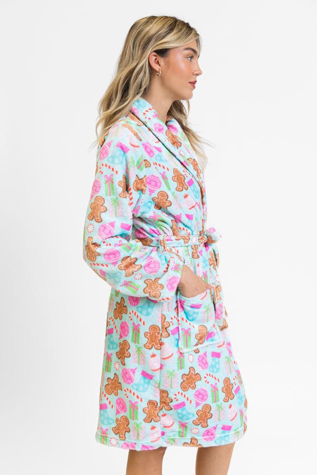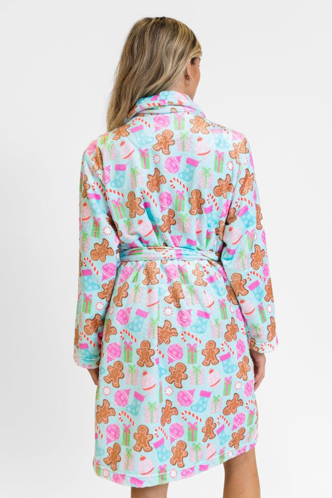 Details Christmas candy canes, gingerbread cookies, presents icons fleece Robe Fabric is very soft, no stretch Adjustable tie belt, inside tie strings, collared style, long sleeves Pair this robe with cozy socks! Lined Size small from shoulder to hem: 37" Material and Care 100% polyester Machine wash cold, no drum drying Patterns may vary Materials may have natural variations Colors may vary from different viewing devices.