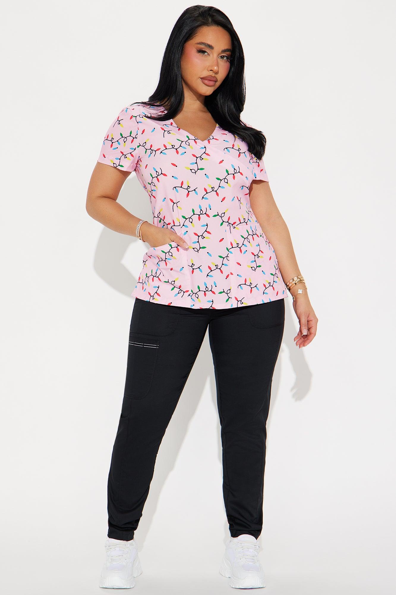 Christmas Lights Stretch Uniform Scrub Top - Pink/combo