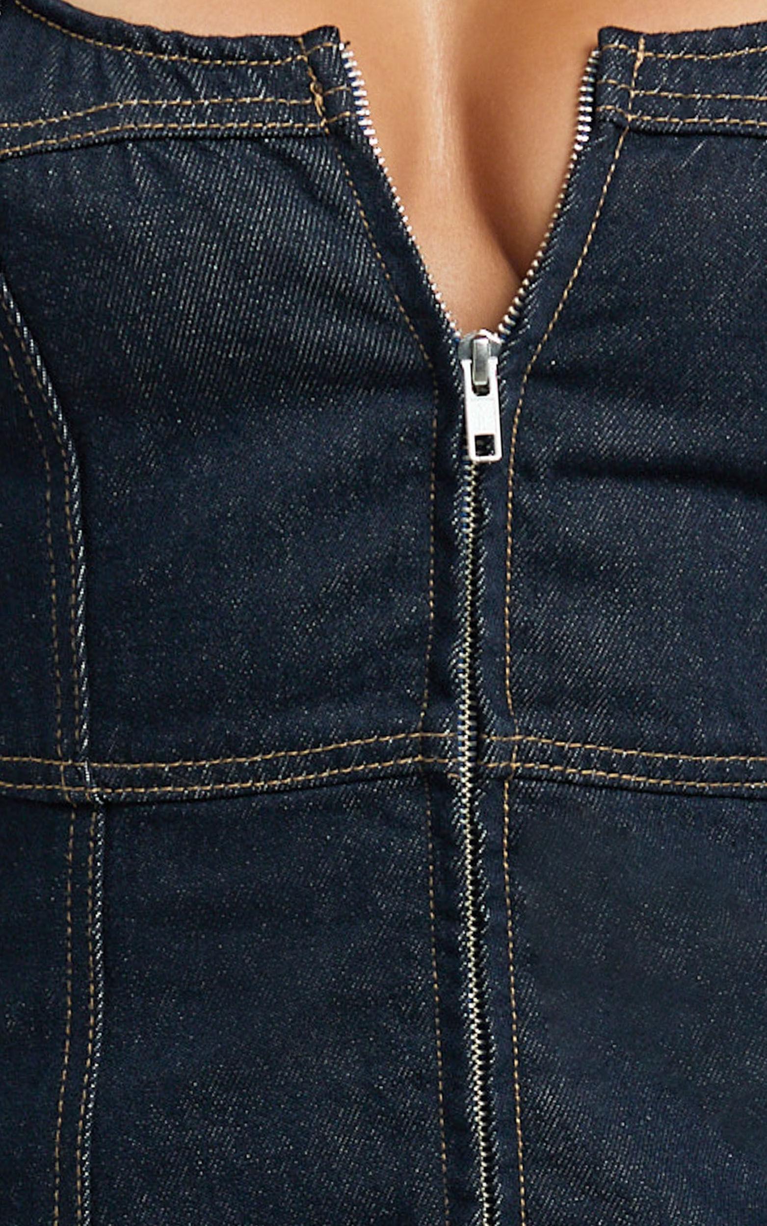 Transform your look with the Chrysoula Mini Dress, a stellar choice that redefines denim's place in your wardrobe. This square neck, zip front sleeveless bodycon dress is tailored from premium raw denim, emphasized with eye-catching tobacco stitching that adds a punch of personality to the classic blue hue. Crafted from soft, breathable cotton, it promises comfort without compromising on style, ensuring you stand out, whether you're exploring the festival scene or curating casual chic looks for daytime adventures.Product Details:Zips featureBodycon fitDenim fabricScoop necklineCasual, FestivalMini lengthSleevelessCotton materialSize and FitSize S / 8 length: 83cm / 32.68inMaterial and Care50% Cotton, 50% Recycled CottonLow / No stretch