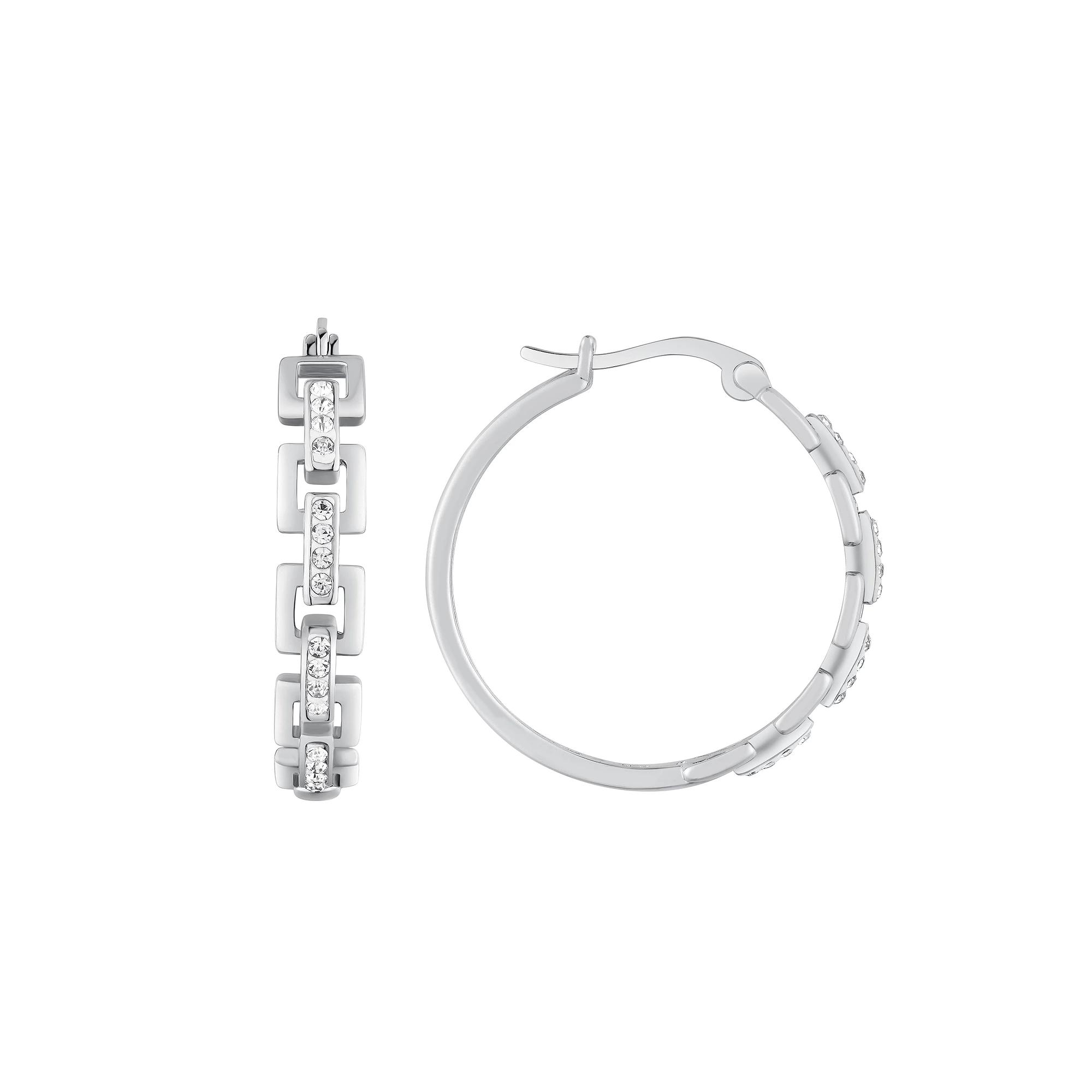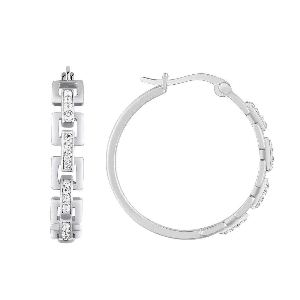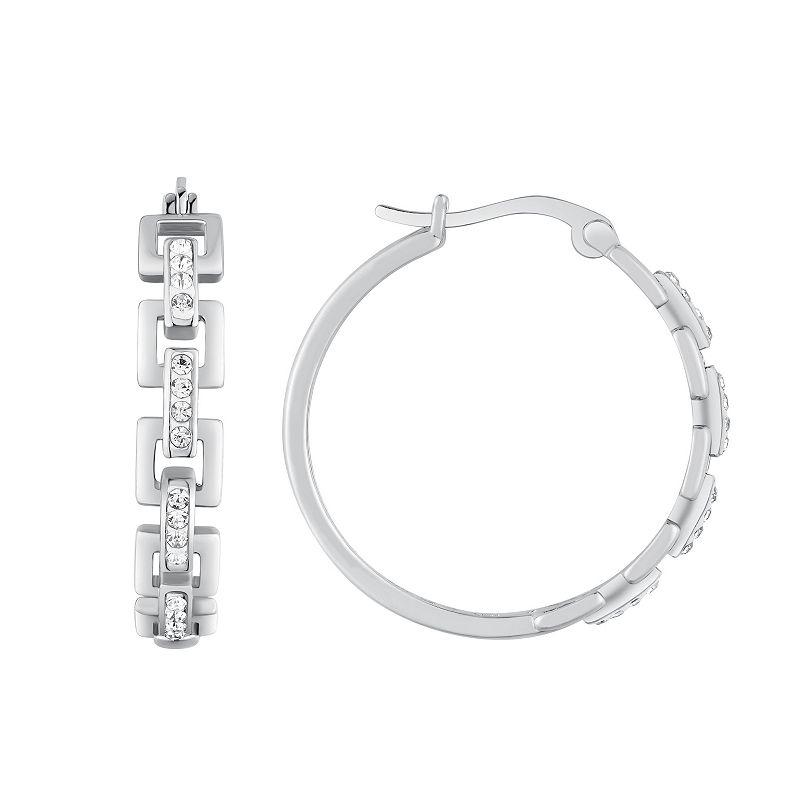 Accessorize in style with these Chrystina Crystal Link Center Hoop Earrings. Accessorize in style with these Chrystina Crystal Link Center Hoop Earrings. Additional details: nickel free Metal: brass Backings: click-it Packaging: boxed Plating: fine silver Finish: polished Earring length: 31mm x 5mmSTONE DETAILS Stone type: crystal Center stone size: 1.3mm x 1.3mm Shape: round Setting: glue/epoxy Color: White. Gender: female. Age Group: adult.