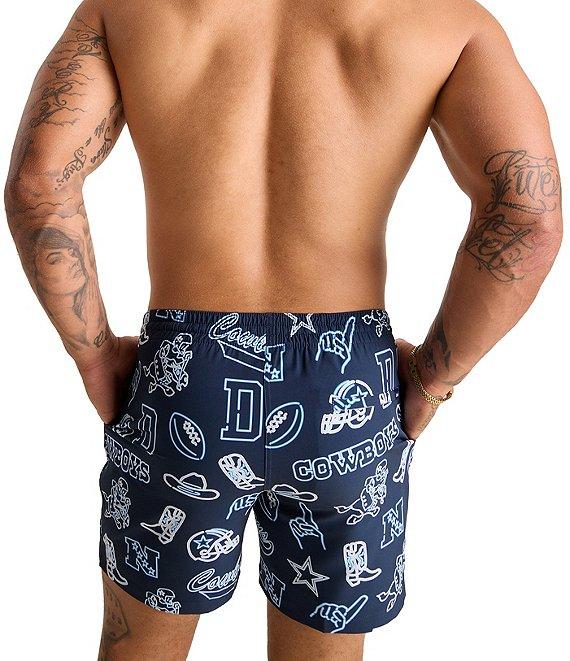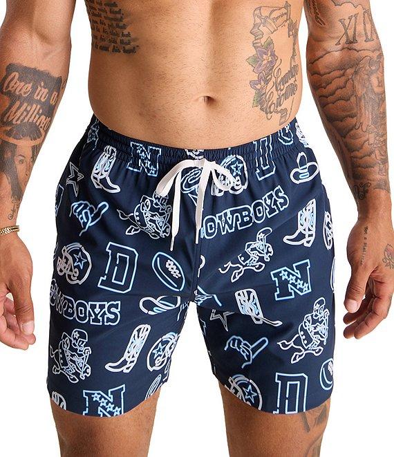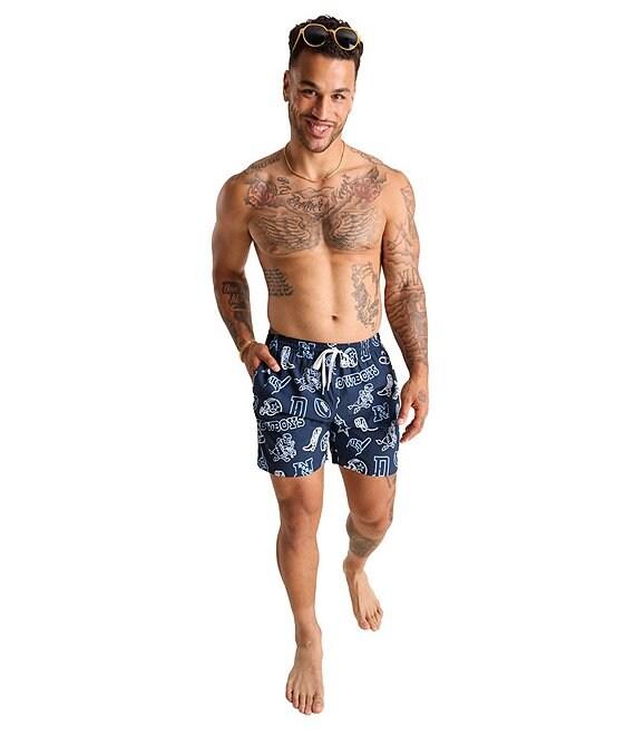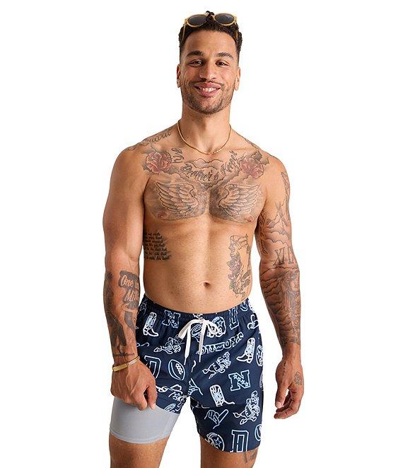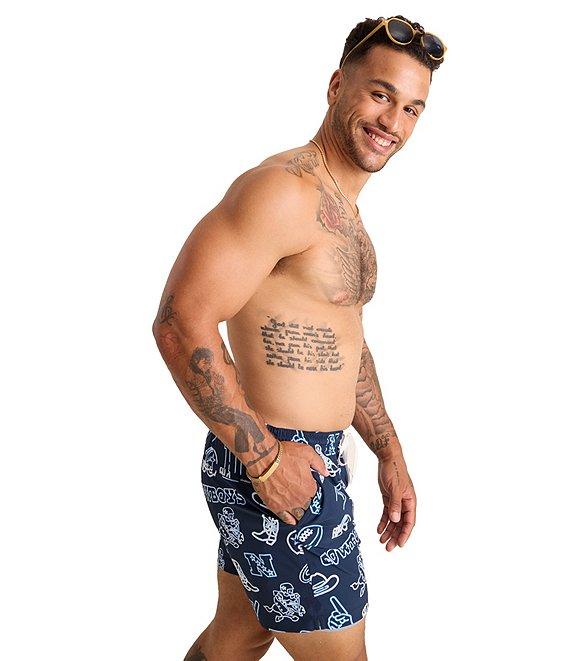 From Chubbies, these swim trunks feature: Half-elastic waistband with internal/external drawstring Built-in boxer brief liner Secret side-zipper pocket Water-resistant antimicrobial fabric UPF 50 5.5 inseam Shell and lining of polyester/spandex Machine wash/tumble dry Imported.