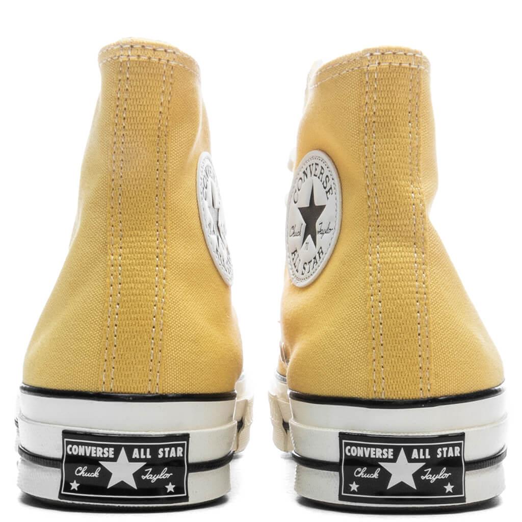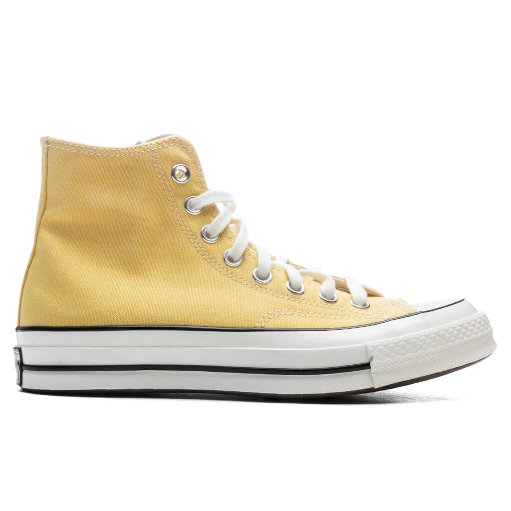 The Chuck 70 HI in Bananas/Egret/Black brings a bold pop of color to a timeless design. Built with a durable canvas upper and high-top silhouette, it features winged tongue stitching and a vintage star ankle patch that nod to its classic roots. Canvas upper High-top Winged tongue stitching Vintage star ankle patch Glossy midsole Ortholite insole cushioning Rubber outsole All sizes are listed in U.S. Men’s sizing unless stated otherwise Style No: A10526F