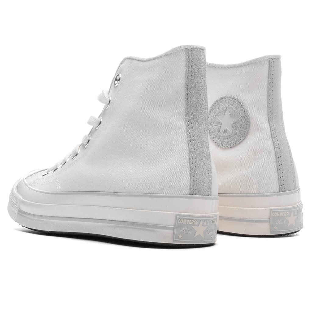 The Chuck 70 HI in Egret/Barely Grey updates a classic silhouette with refined details. Featuring a durable canvas upper and a high-top design, this sneaker is crafted for timeless appeal. Winged tongue stitching and a vintage star ankle patch highlight its heritage-inspired aesthetic, while a glossy midsole adds a polished touch. Canvas upper High-top Winged tongue stitching Vintage star ankle patch Glossy midsole Ortholite insole cushioning Rubber outsole All sizes are listed in U.S. Men’s sizing unless stated otherwise Style No: A10495C
