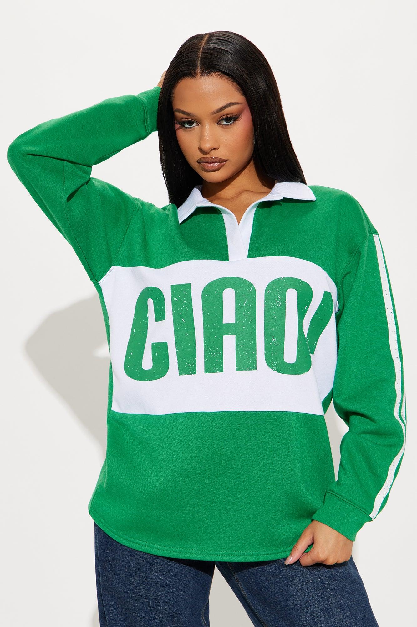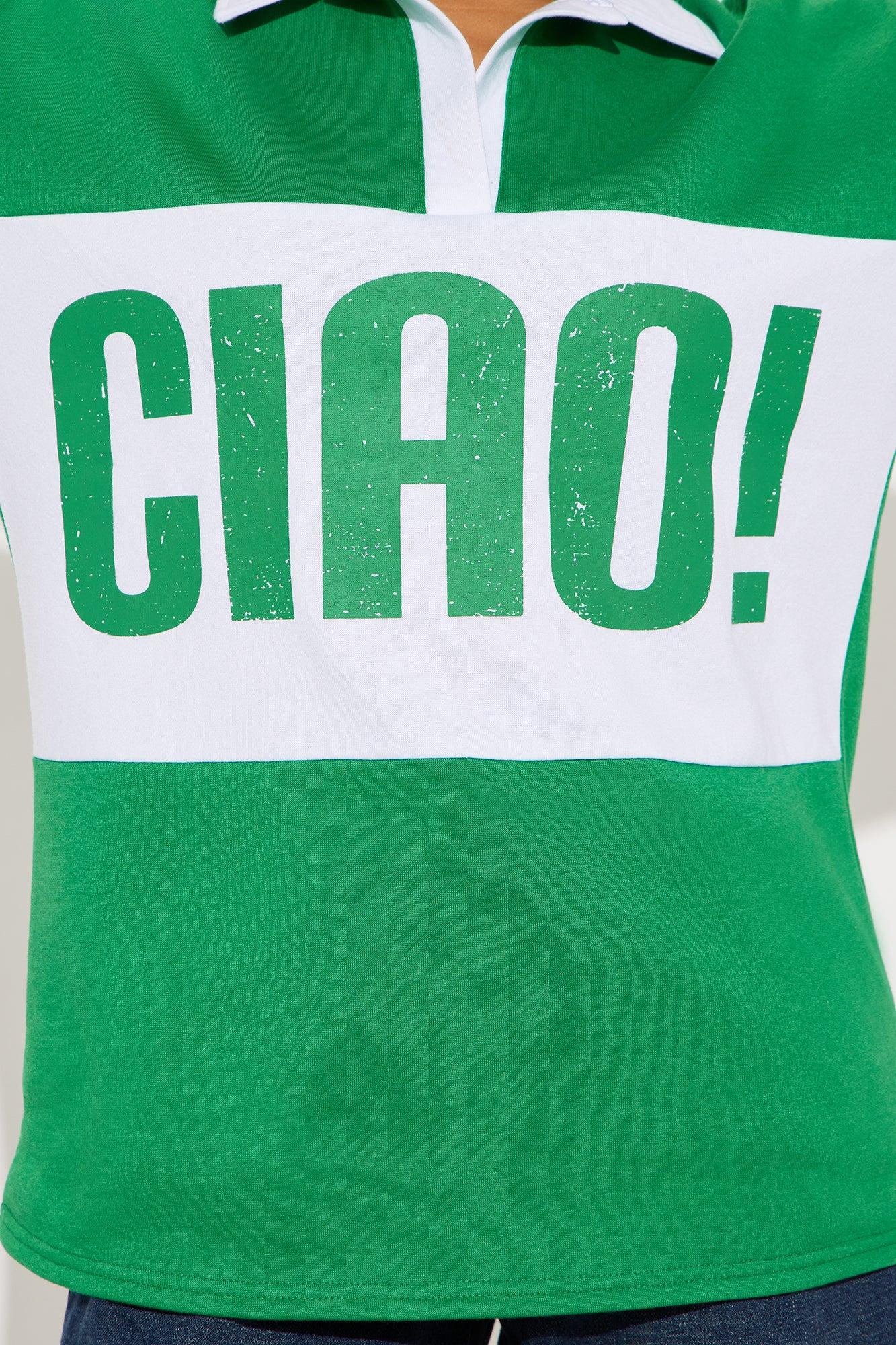Available In Green/combo. Pull Over Polo Stretch "Ciao" Graphic Disclaimer: Due To The Printing Process A Difference In Saturation May Occur. Each Garment Is Unique. Body: 65% Polyester 35% Cotton Rib: 60% Polyester 35% Cotton 5% Spandex Imported