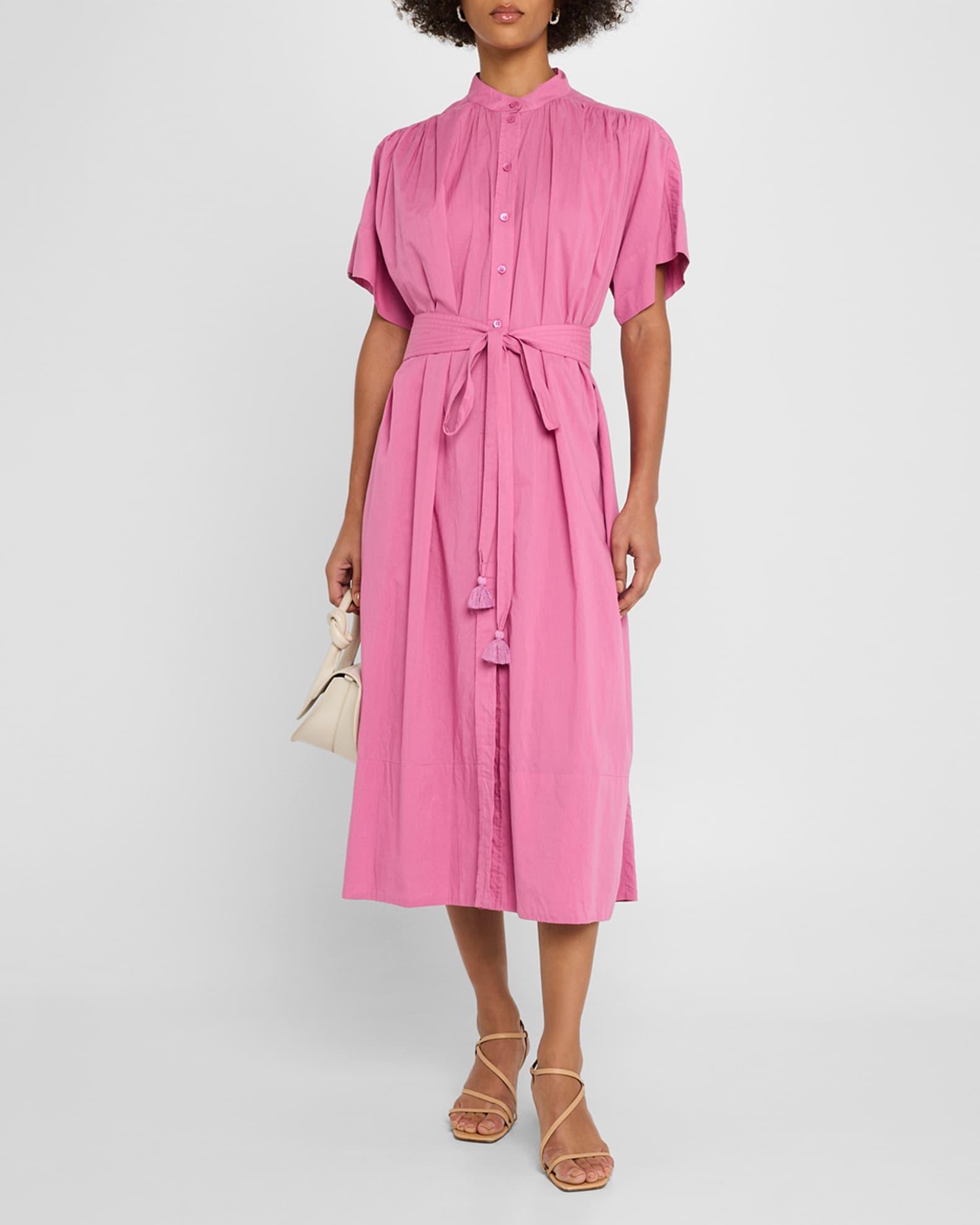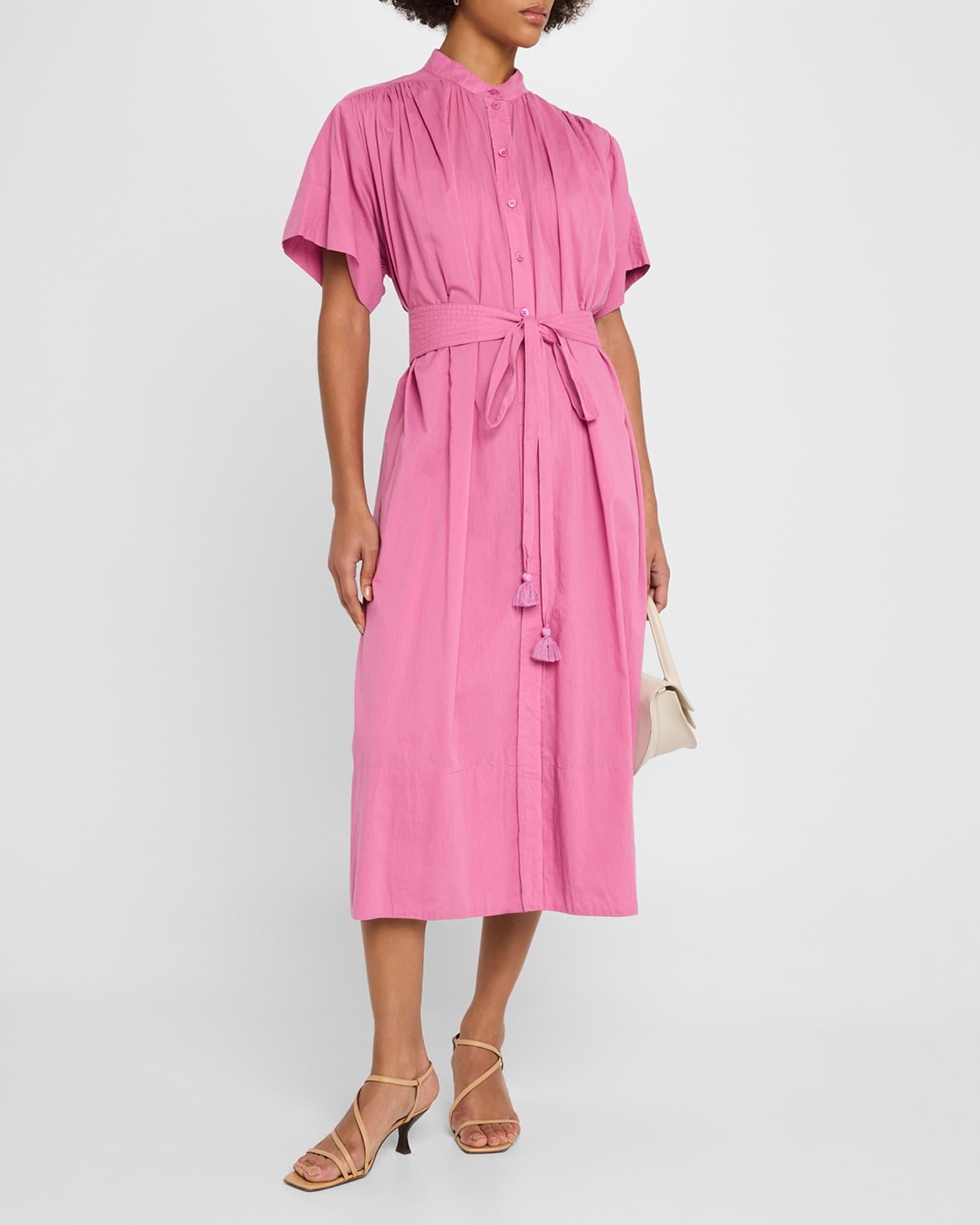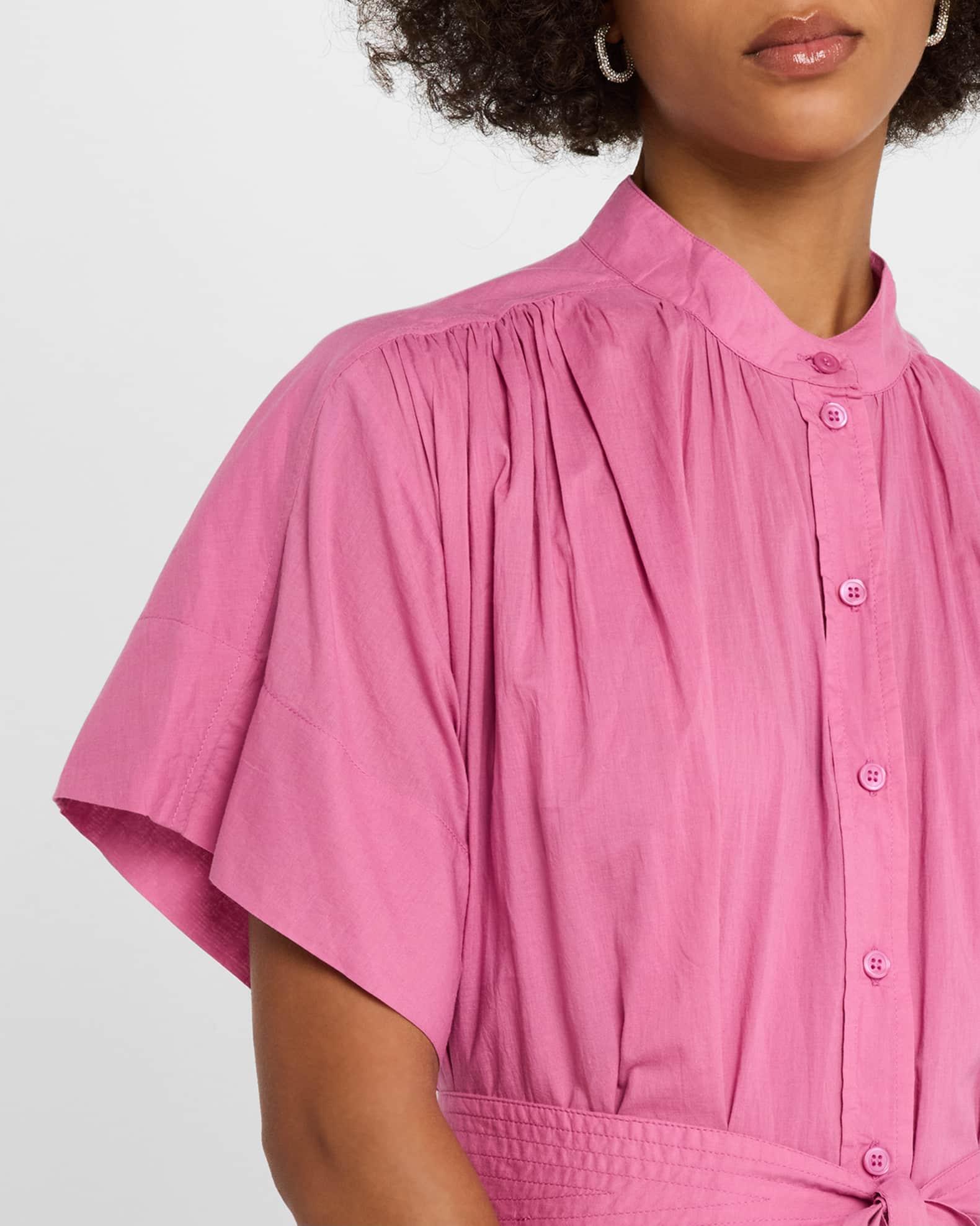 Vanessa Bruno "Ciao" ruched midi shirtdress with topstitched and tasseled waist self-tie Band collar; button front Short sleeves; approx. 8.5"L Ruched back yoke Hem falls below the knee A-line silhouette Cotton Lining: Cotton Machine wash Imported