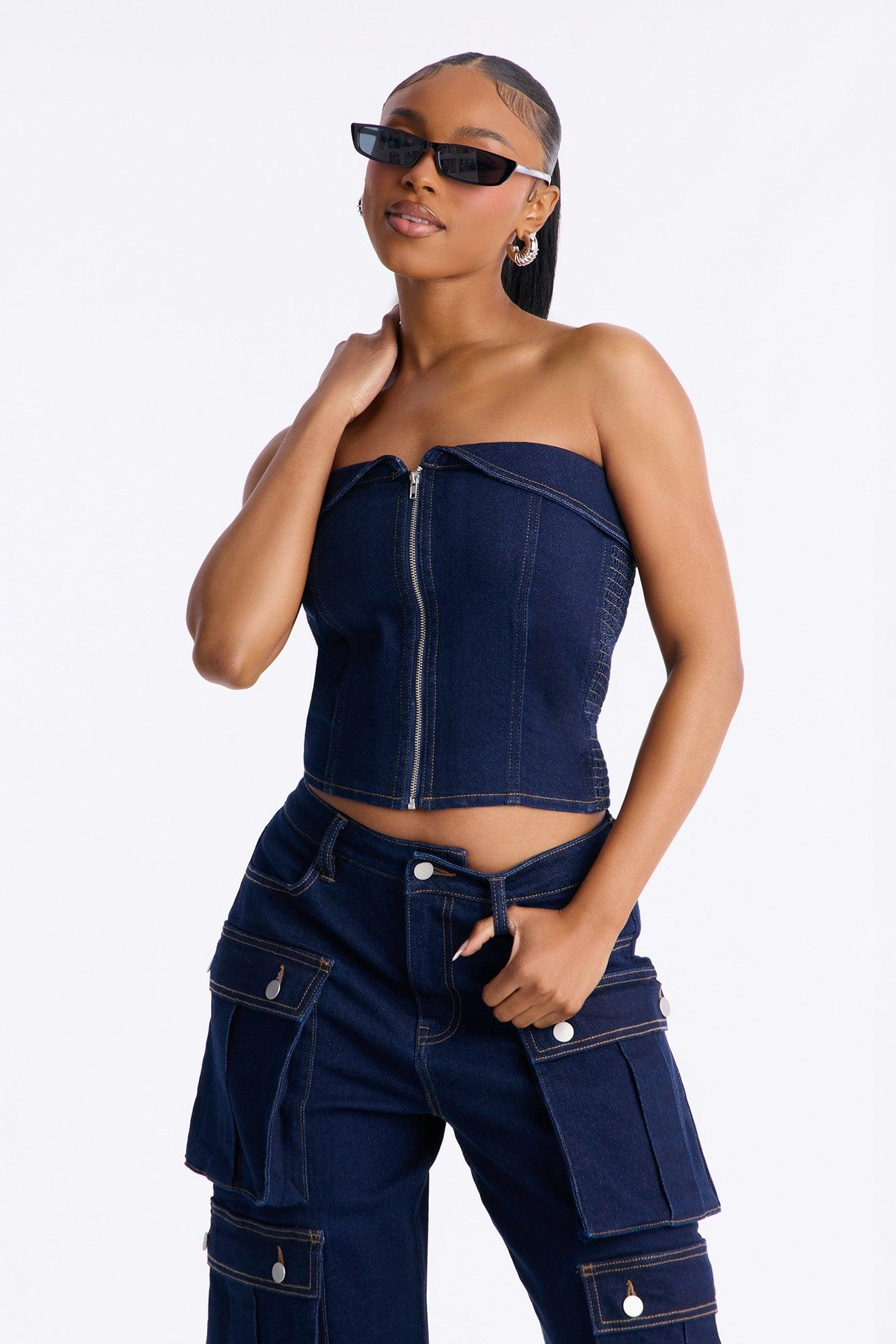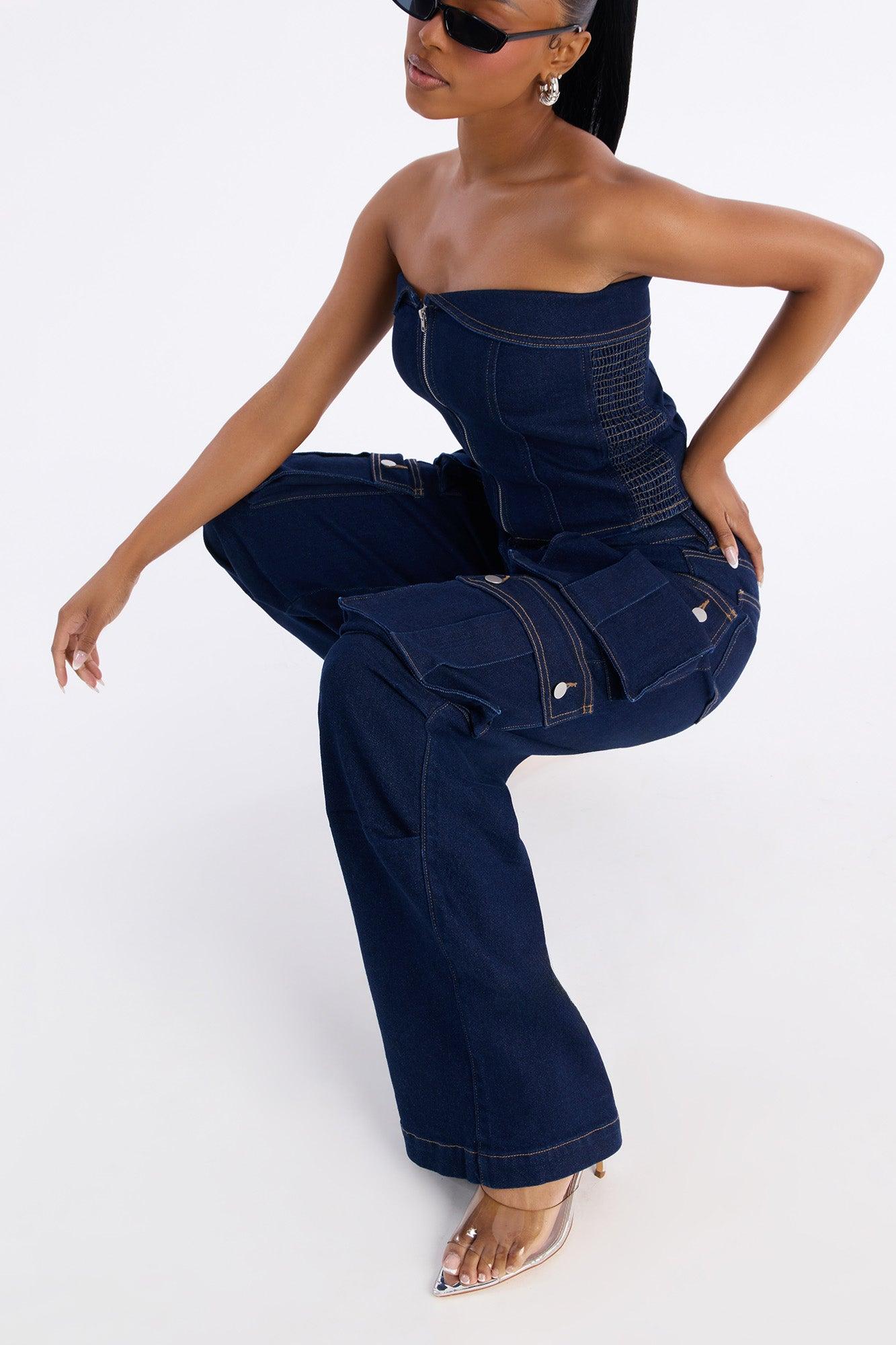 Available In Dark Denim And Light Wash. 2 Piece Ensemble Denim Pant Set Strapless Fold Over Detail Smocking Detail Front Metal Zipper Wide Leg Button Zipper Closure Cargo Pockets Stretch Inseam: 30" 99% Cotton 1% Spandex Imported California Proposition 65WARNING: Cancer and Reproductive Harm - www.P65Warnings.ca.gov.