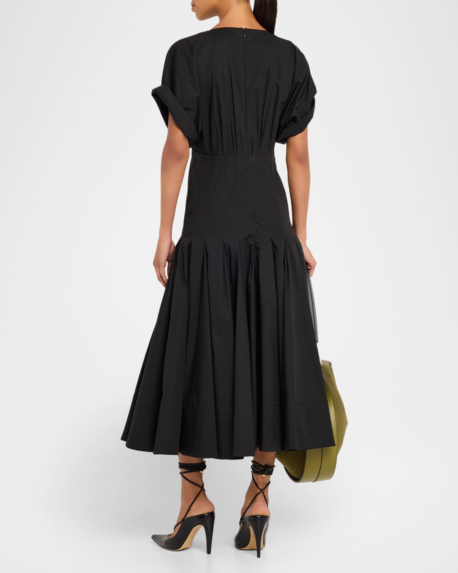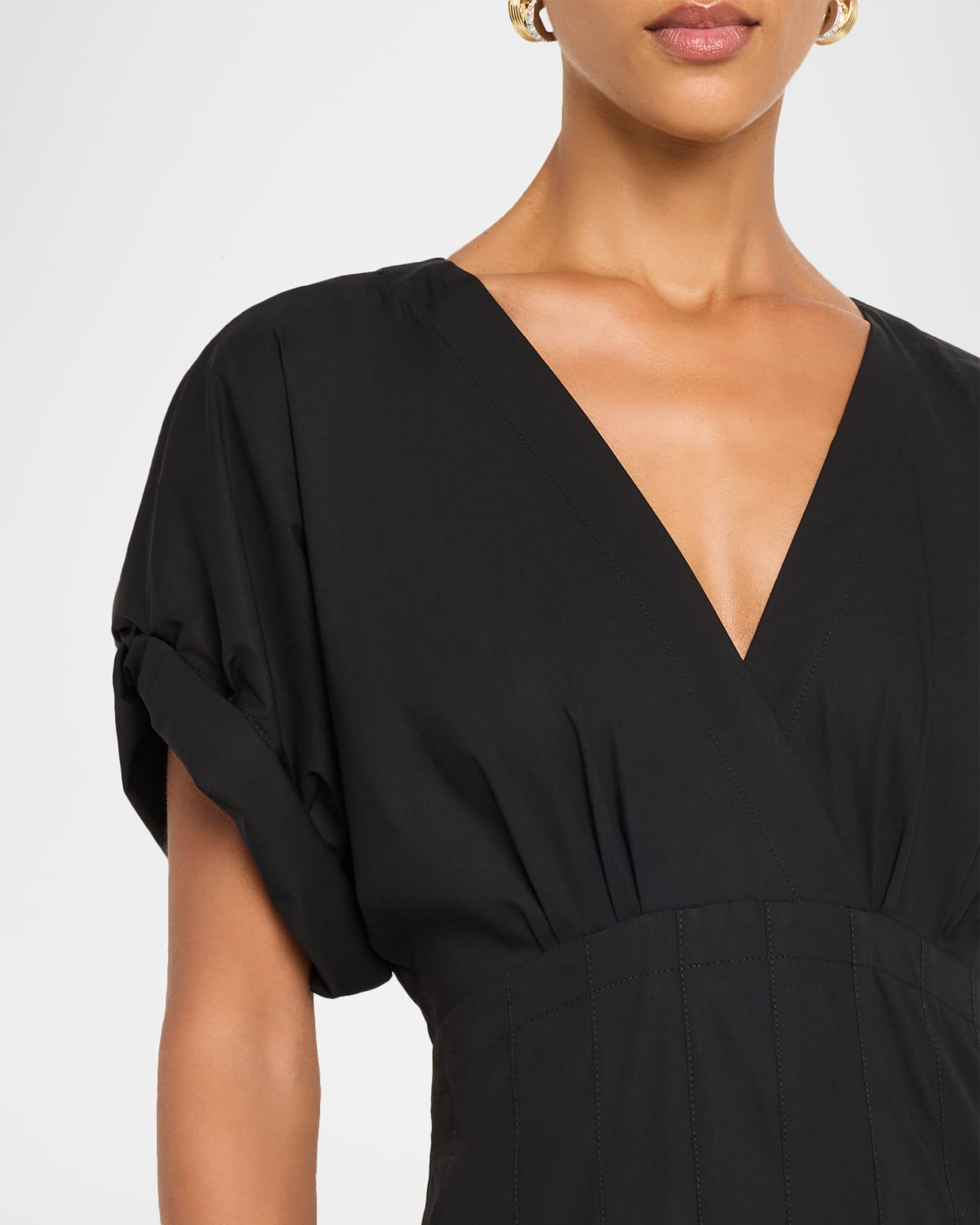 Proenza Schouler "Ciara" eco compact poplin dress featuring a drop waist panel with skirt godets Surplice neckline Short sleeves; rolled cuffs Drop waist A-line silhouette Hem falls below the knee Back zip Cotton/elastane Dry clean Made in Poland