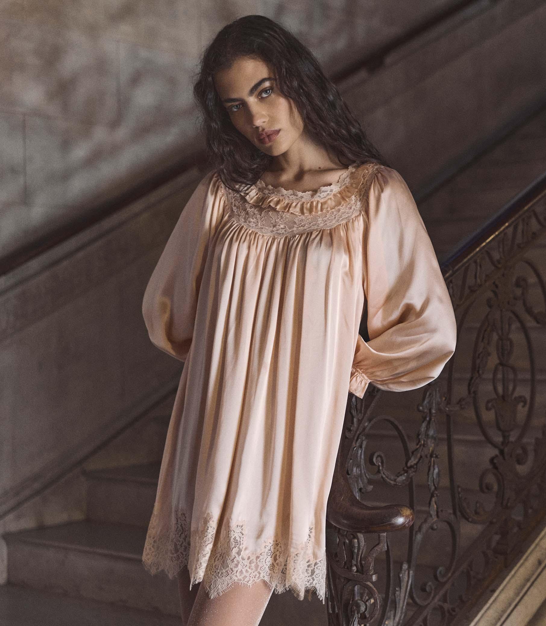 Nodding to babydoll dresses of the 1960s, the Cicely is crafted from lustrous silk satin and trimmed with floral lace along the bateau neckline and mini-length hem. Generous full-length sleeves finish in loosely elasticated cuffs with delicate picot edging.