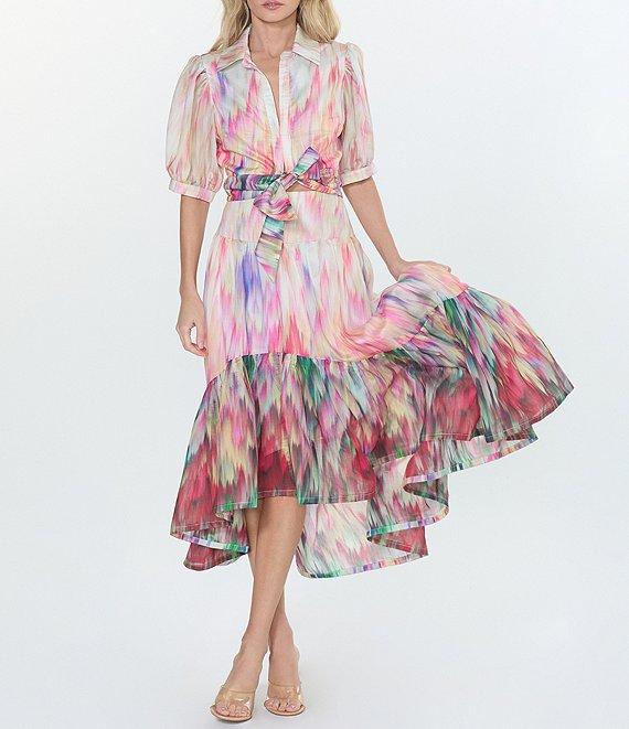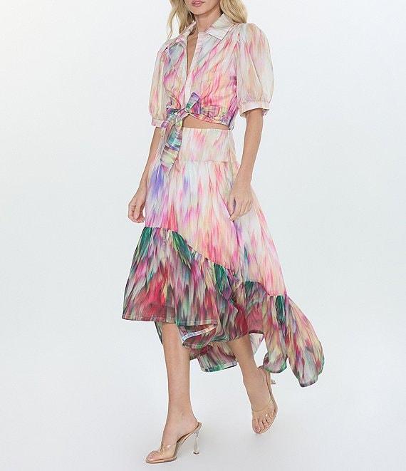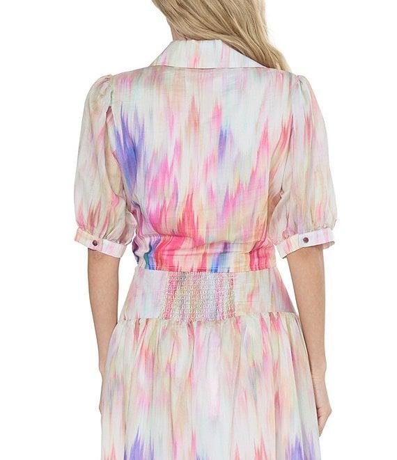 From CIEBON, this top features: Printed voile fabrication Collar neckline Short puff sleeve with cuff Self tie front closure Cropped length Approx. 17 7/8" length Lyocell/polyester Hand wash Imported.