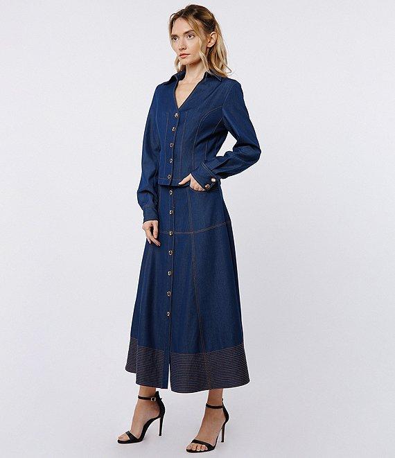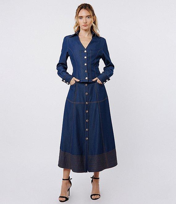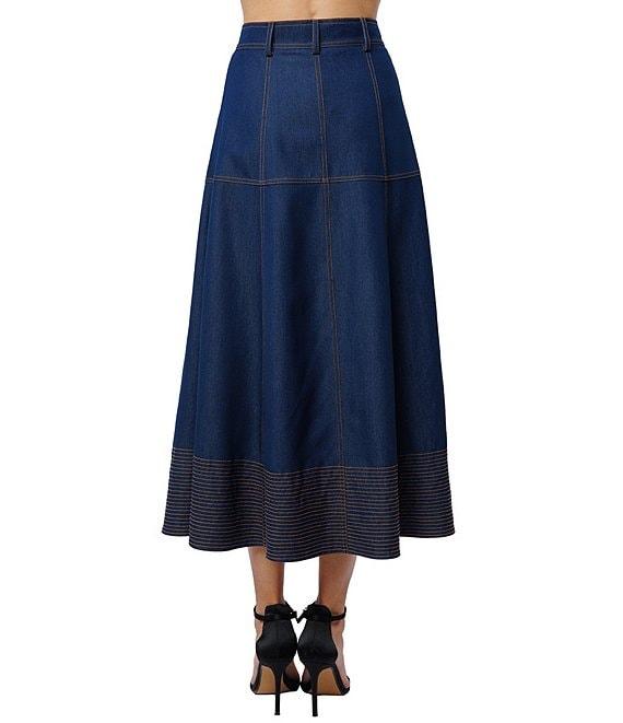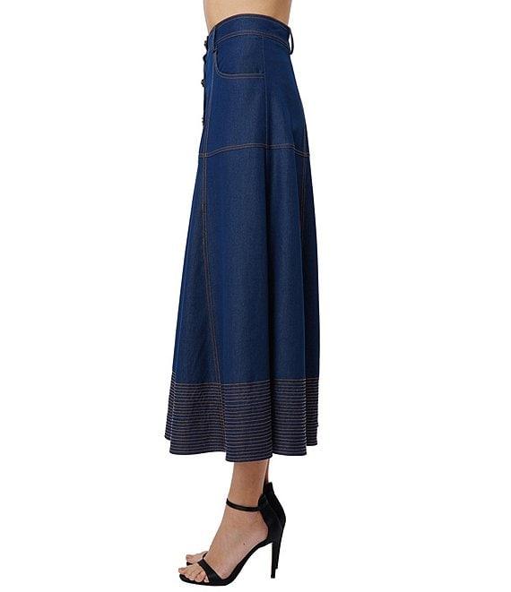 From CIEBON, this skirt features: Denim fabrication A-line silhouette High waist Slant front pocket Paneled seam Top stitching at hemline detail Unlined Structured hemline Metal buttons Button front closure Approx. 34.25" length Lyocell/rayon/spandex Hand wash Imported.