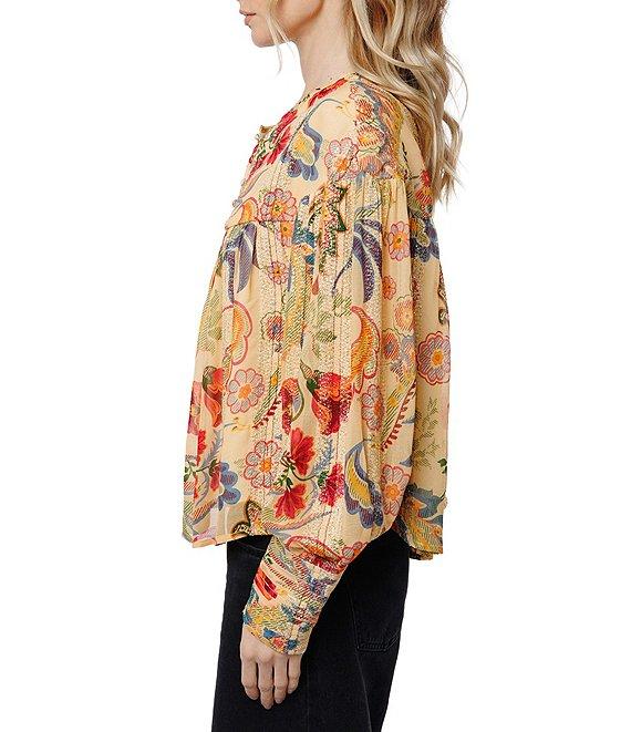 From CIEBON, this top features: Metallic jacquard georgette fabrication Blouse silhouette Floral print Split neckline Long sleeves with button cuffs Flowy fit Fully lined Flutter hemline Pullover construction Approx. 23" length Viscose/metallic Dry clean Imported.