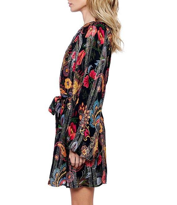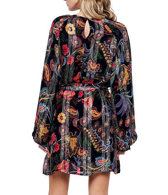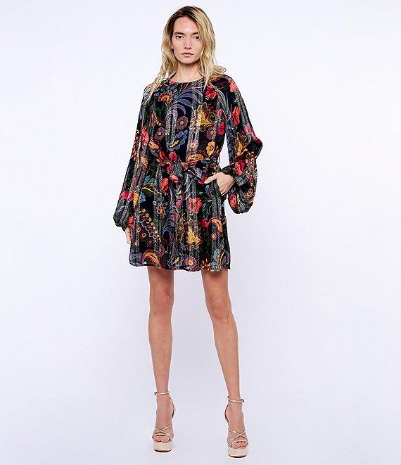 From CIEBON, this dress features: Metallic jacquard georgette fabrication Sheath silhouette Metallic stripe floral print Boat neckline Long balloon sleeves Side pockets Self tie belt Relaxed fit Unlined Straight hemline Keyhole button back closure Approx. 36" length Viscose/metallic Dry clean Imported.