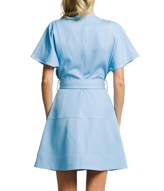 From CIEBON, this dress features: Faux denim fabrication V-neckline Short wide sleeves Back zipper closure Self cover buckle detail Front patch pocket detail Approx. 34" length Polyester/rayon/spandex Hand wash Imported.