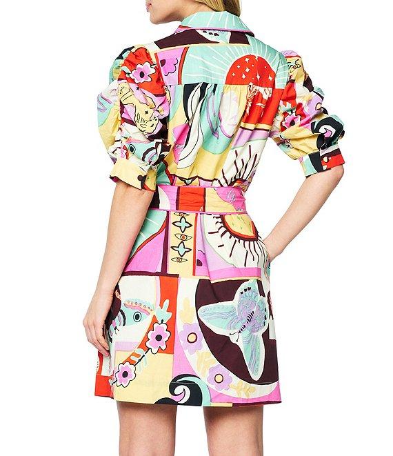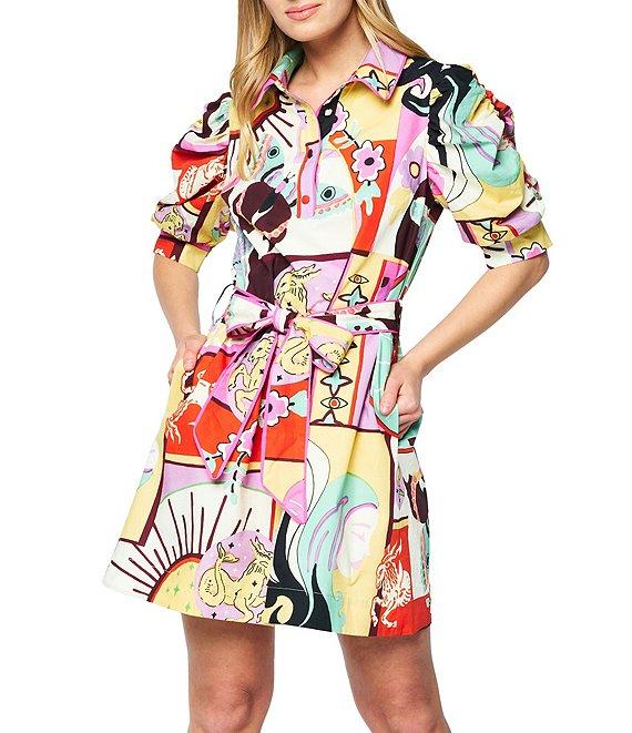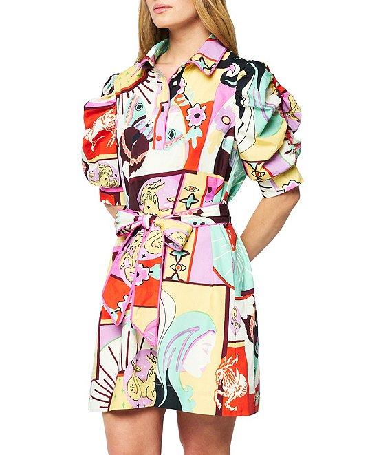 CIEBON Scarlette Printed Poplin Point Collar Puff Sleeve Button Front Shirt Dress