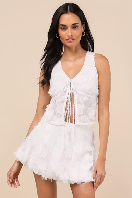 A day spent wearing the Lulus Cilla White Textured Bubble-Hem Skort will be a day feeling endlessly cute! This cute mini skort is composed of lightweight woven fabric, adorned with a frayed effect, floral jacquard texture and a subtle grid-like pattern throughout. The A-line silhouette features a high-rise fit, pleated detailing, and a trendy bubble-hem. Attached shorts underneath for comfortable wear. Hidden side zipper/clasp. Pair with the matching top for a complete look!