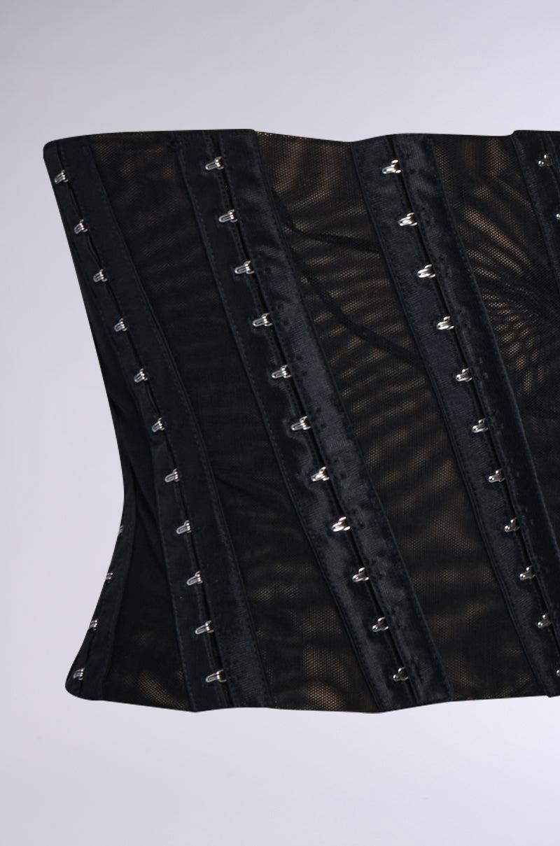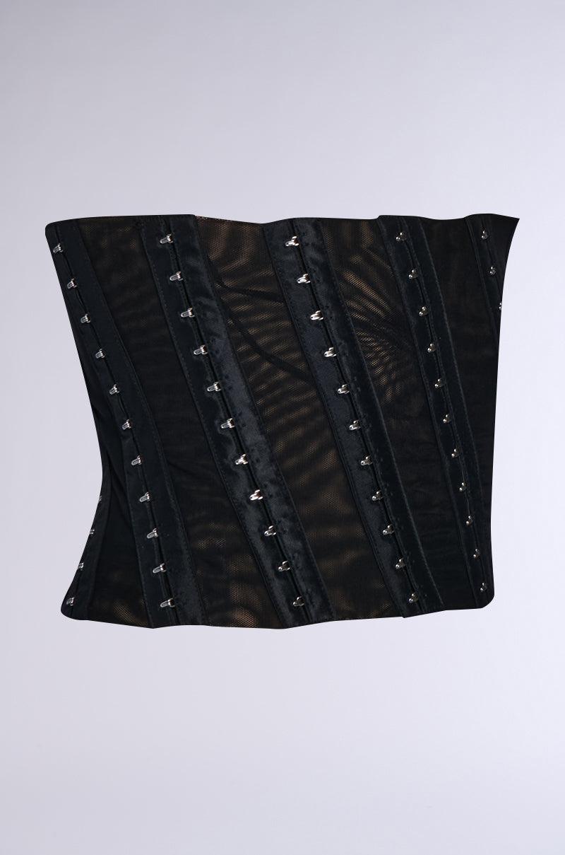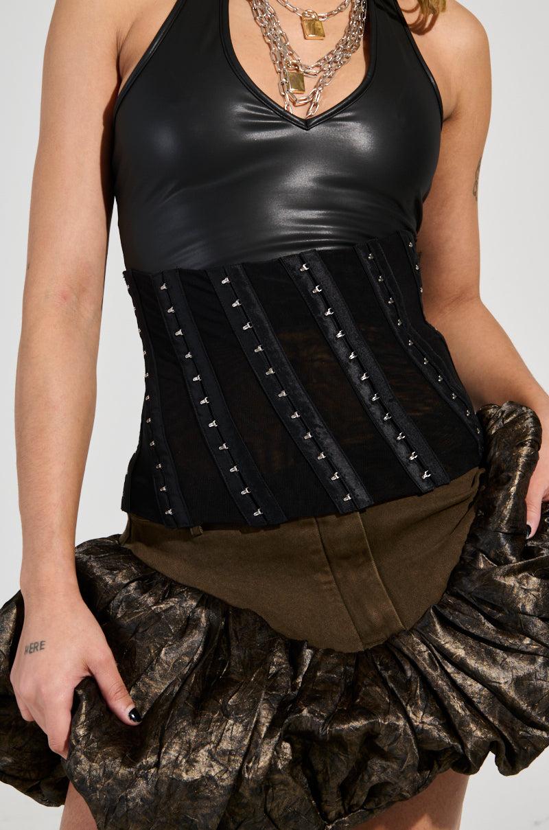 Lock in with The AKIRA Label Cinch Me Up Stretch Belt. This edgy accessory is crafted from a stretchy double-lined mesh knit base and features alternating panels of semi-sheer mesh and faux leather trim with faux silver metallic hook and eye detailing. Complete with a metallic back zipper closure. Style atop a button down blouse for a chic finish. - Shell: 95% Polyester 5% Spandex- Stretchy- Imported (all measurements approximate from size S/M)- 8.5” Chest to Hem- 24.5” CircumferenceProduct ID: 468102 (all measurements approximate from size 1X/2X)- 9” Chest to Hem- 27” CircumferenceProduct ID: 468104