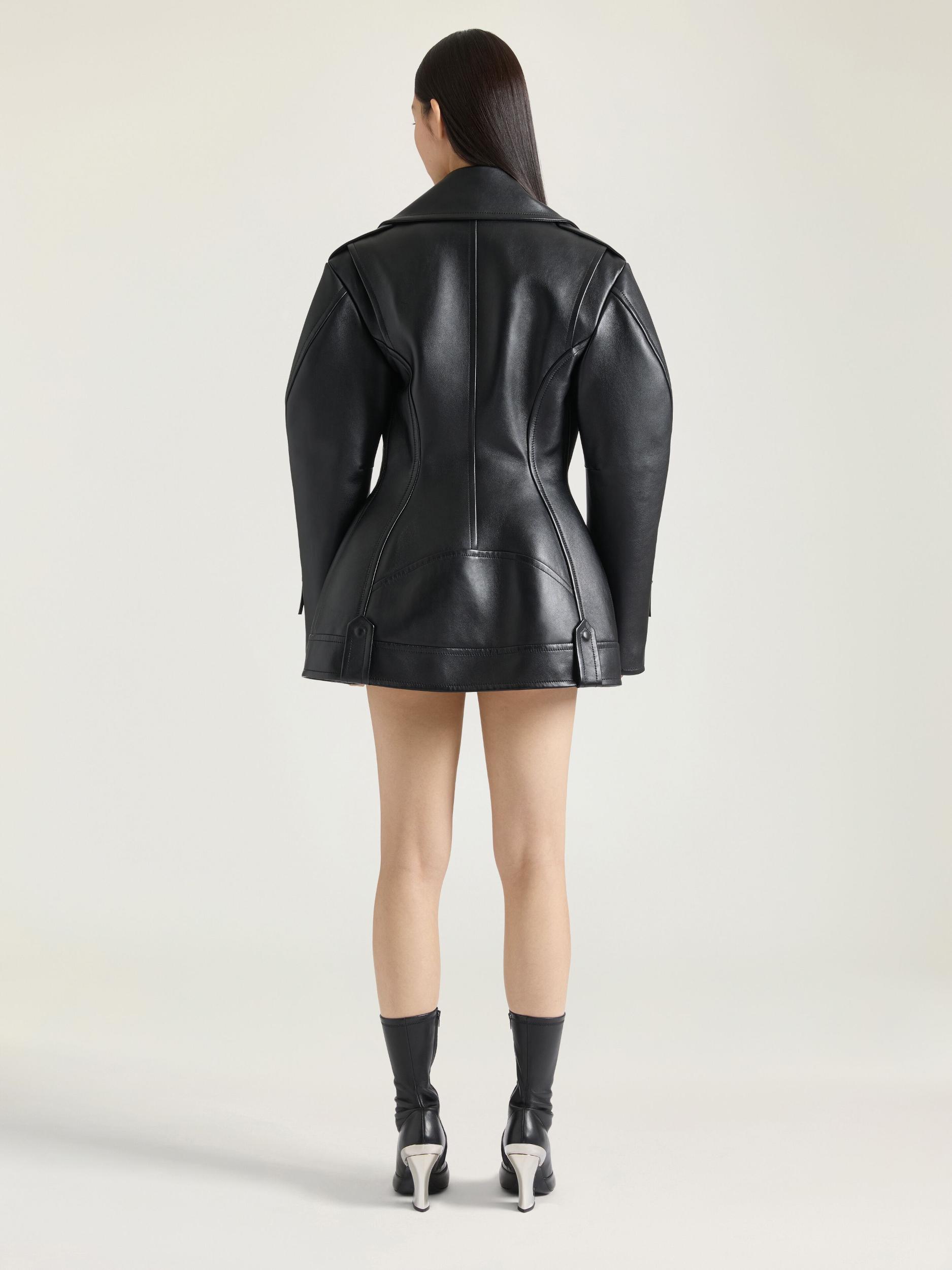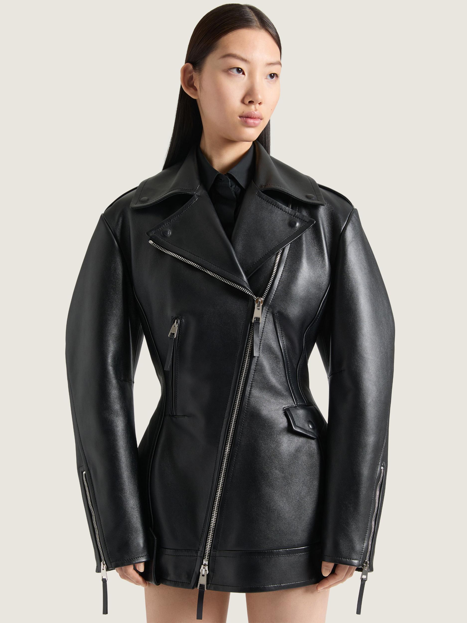 Hourglass jacket in leather. Zipped closure on bias. One zipped pocket on the right side and one flap pocket on the left side. Metal zippers on the cuffs. Cinched waist. Bias seams for a cocooning volume. Model measures 5.8 Feet and wears a size 36.
