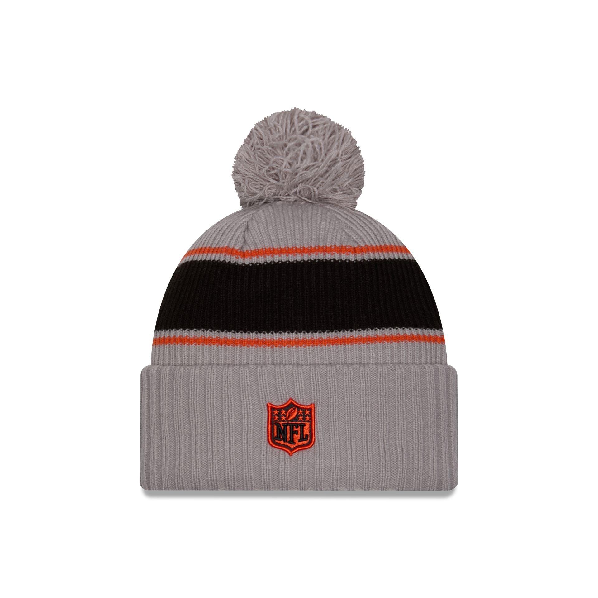 The Cincinnati Bengals 2024 Cold Weather Gray Pom Knit Hat features an embroidered Bengals logo at the front cuff with a matching NFL Shield at the rear. Additional details include a team wordmark at the crown and a one-time removable pom.