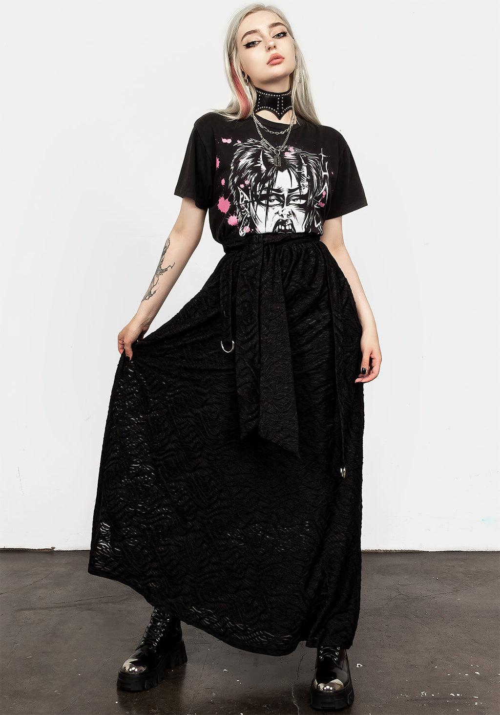 Feel the spark of inspiration.✦ Black textured maxi skirt ✦ Maxi-length full skirt falls to the floor ✦ Self-fabric belt ties at front✦ Ornamental self-fabric strips end with silver D-rings✦ Two handy side pockets (super deep to hide your secrets) ✦ Concealed button and zipper fastening at back for seamlessness ✦ Textured sheer fabric overlays solid black non-stretch lining✦ Hear that? It's the sound of Future You swishing dramatically into every room Main fabric: 97% polyester, 3% elastane Lining: 100% polyester Tanya is 5'5" and wearing a UK8
