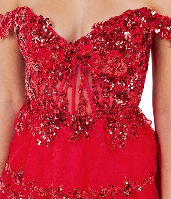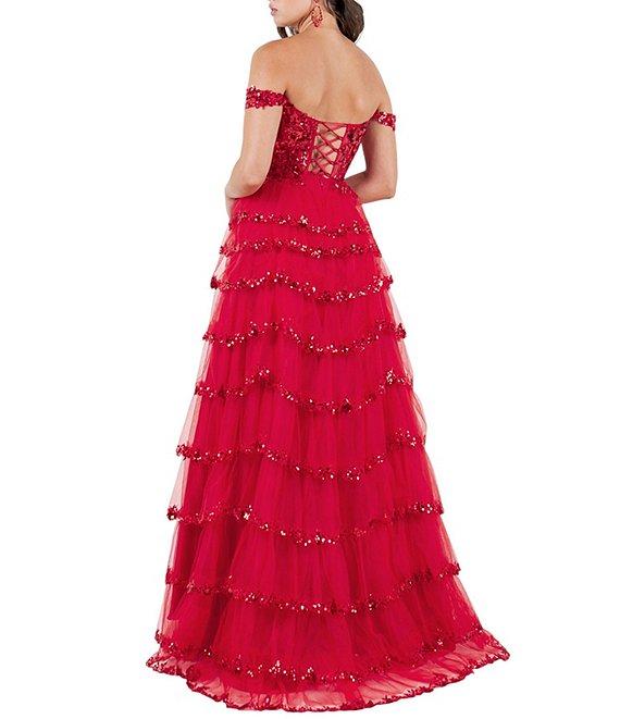 Cinderella Couture Off-The-Shoulder Sequin Beaded Bodice Tiered Tulle Ruffled A-Line Gown