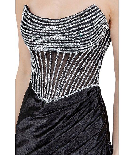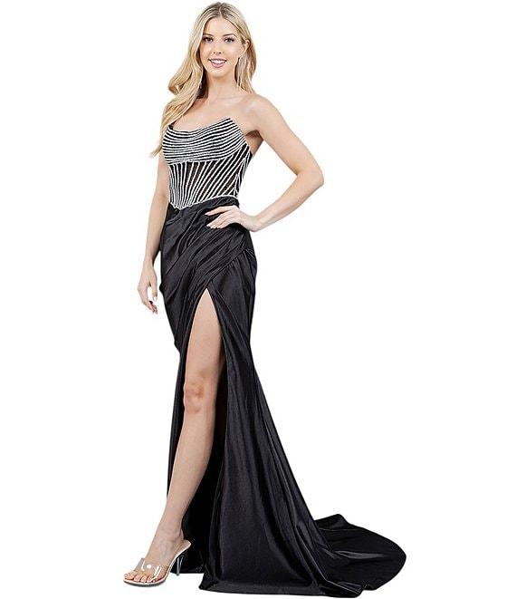 From Cinderella Couture, this gown features: Rhinestone beaded fabric Strapless neckline Corset bodice Side ruching Side slit Lace up back closure Polyester; lined Dry clean Imported.