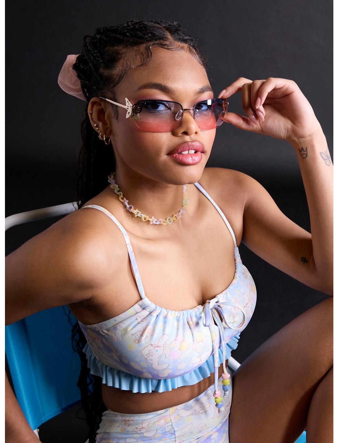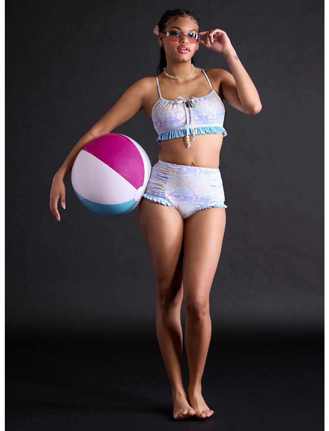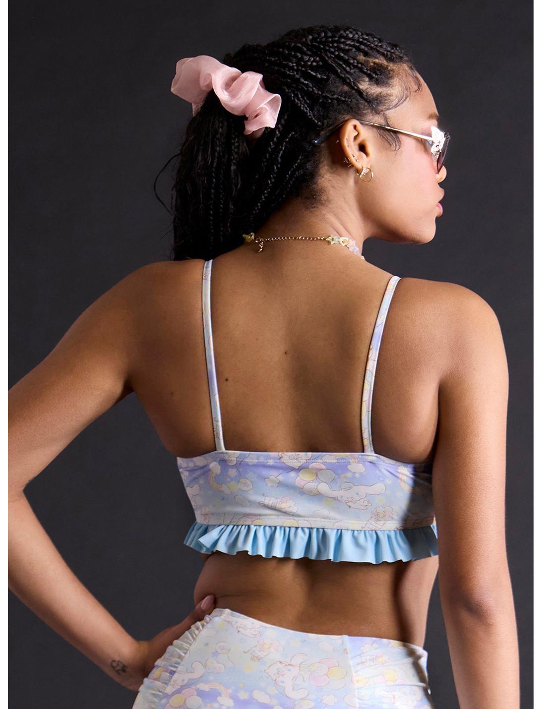 Soak up some sunshine with your favorite Sanrio cutie! This swim top features a pastel allover print of Cinnamoroll floating with balloons, surrounded by dreamy stars, clouds, rainbows and more. Designed with ruching at the neckline, star bead accents on the ties and light blue ruffle trim along the bottom. Comes with removable padding. Pair it with the matching bottoms for the ultimate beach day vibe!Bottoms not included.Swimwear can only be returned unworn with original tags intact and sanitary panel in place.82% nylon; 18% spandexHand wash cold; dry flatRemovable paddingImportedListed in junior sizesModel wears size Small