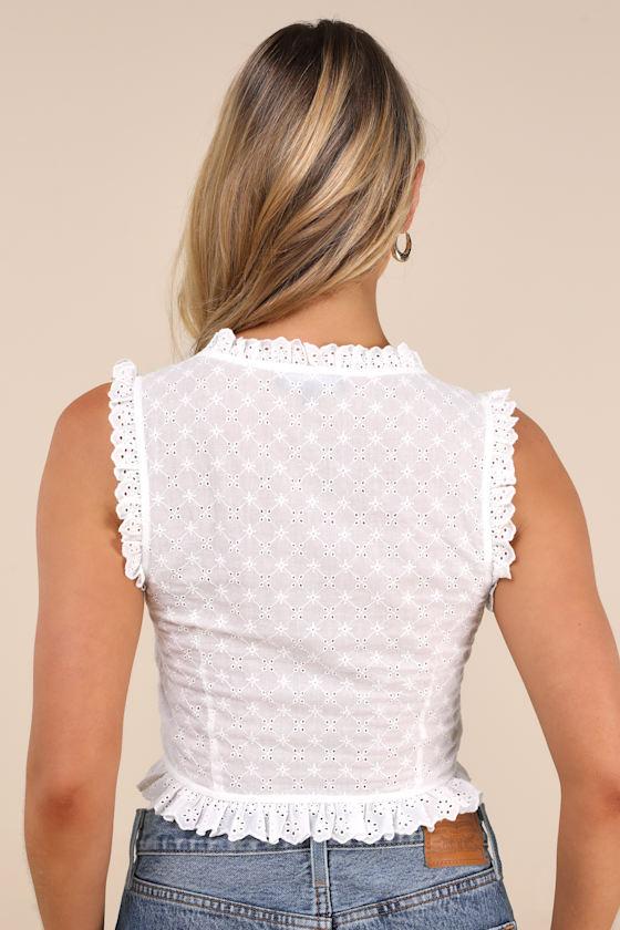 Ready to frolic through any field, this adorable top features an eyelet-embroidered composition that pairs best with a sunny day. Wide straps support a flattering scoop neckline and a fitted, button-front bodice with a cropped hem. Matching ruffly trim adorns the neckline, straps, and hem for a cute-as-can-be finish.