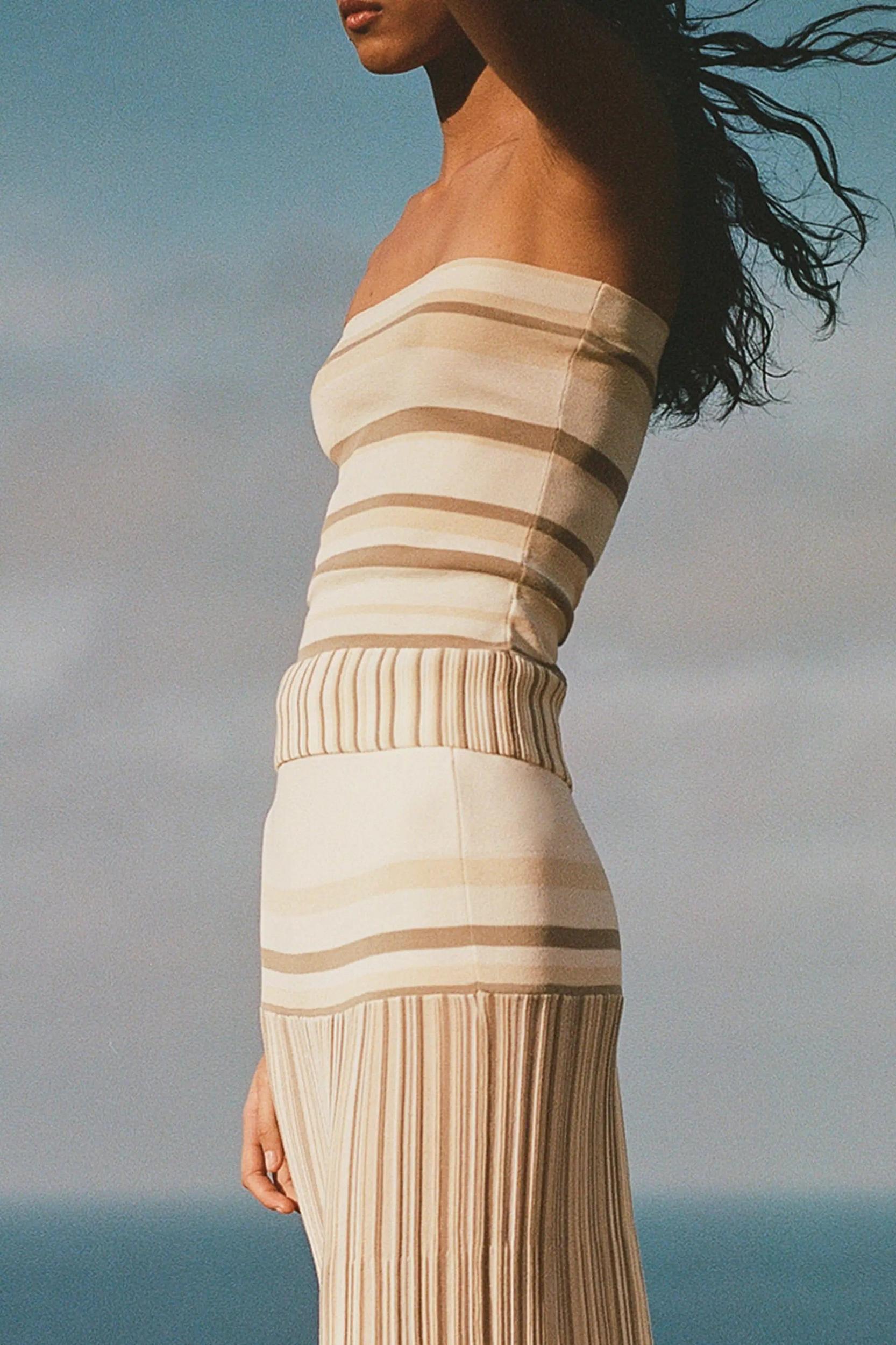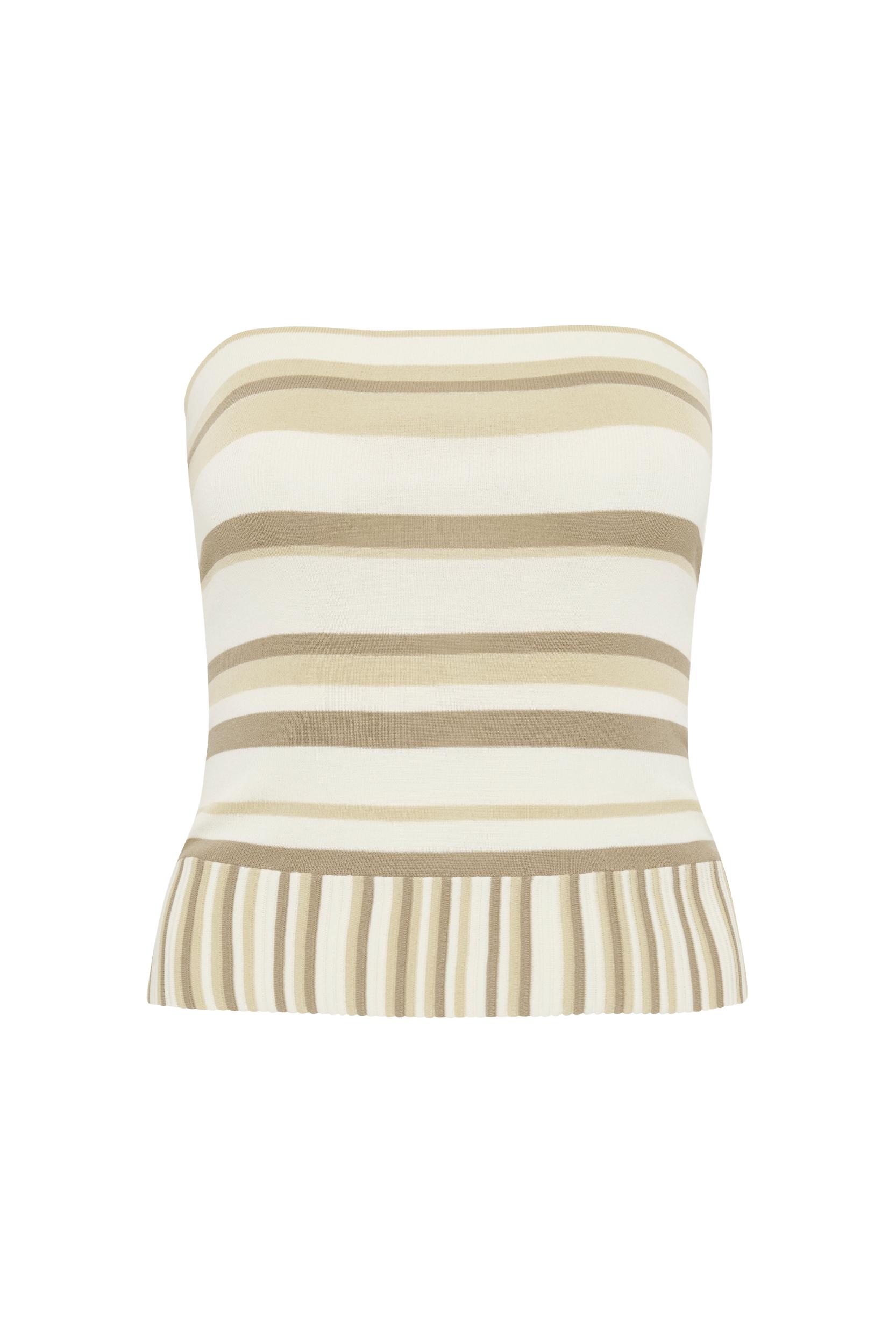 A fitted strapless top, designed in FAITHFULL’s signature stripe and a true knit fabrication. With elastane woven through the bust for additional support, it is cropped short at the waist to sit in line with the Citara Skirt. Style the pieces together for elegant, summer occasionwear. Semi-sheer in finish, wear over neutral intimates.