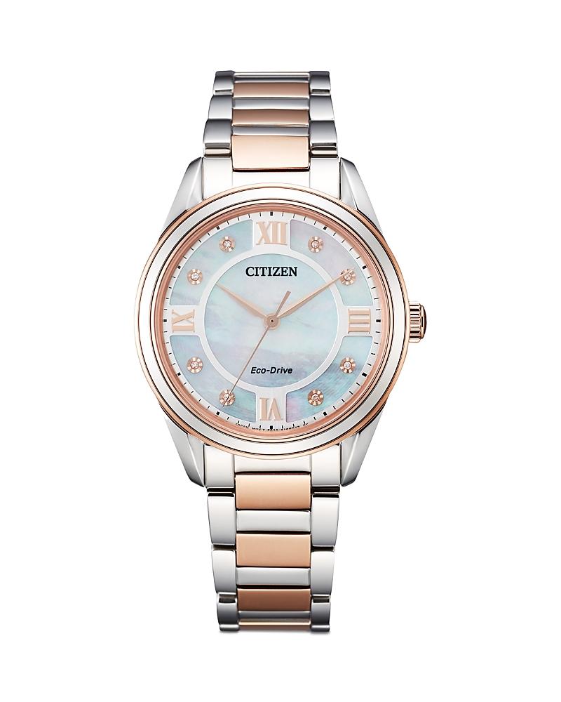 With a new silhouette that marries classic design with sophisticated elegance, the Arezzo from citizen is a ladies timepiece sure to turn heads wherever it goes. It has a stainless-steel bracelet with a deployment clasp and the slightly oversized, 32mm, stainless-steel case features a three-hand silver-tone dial, Roman numerals with a diamond accent. The watch also uses eco-drive technology, meaning it is powered by light any light and will never need to be recharged.Number of Batteries: 1Features: Diamond AccentBattery Type: Lithium IonPower Source: EcodriveWatch Movement: QuartzWater Resistance: 50mBand Color: Silver ToneDial Color: Silver ToneMetal Color: Silver ToneCase Thickness: 7.8mmCase Width: 32mmBand Content: Stainless SteelCase Materials: 100% Stainless SteelBand Width: 16mmCare: Wipe CleanCountry of Origin: Imported