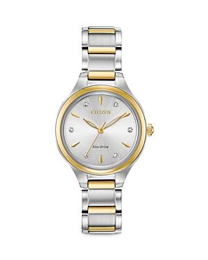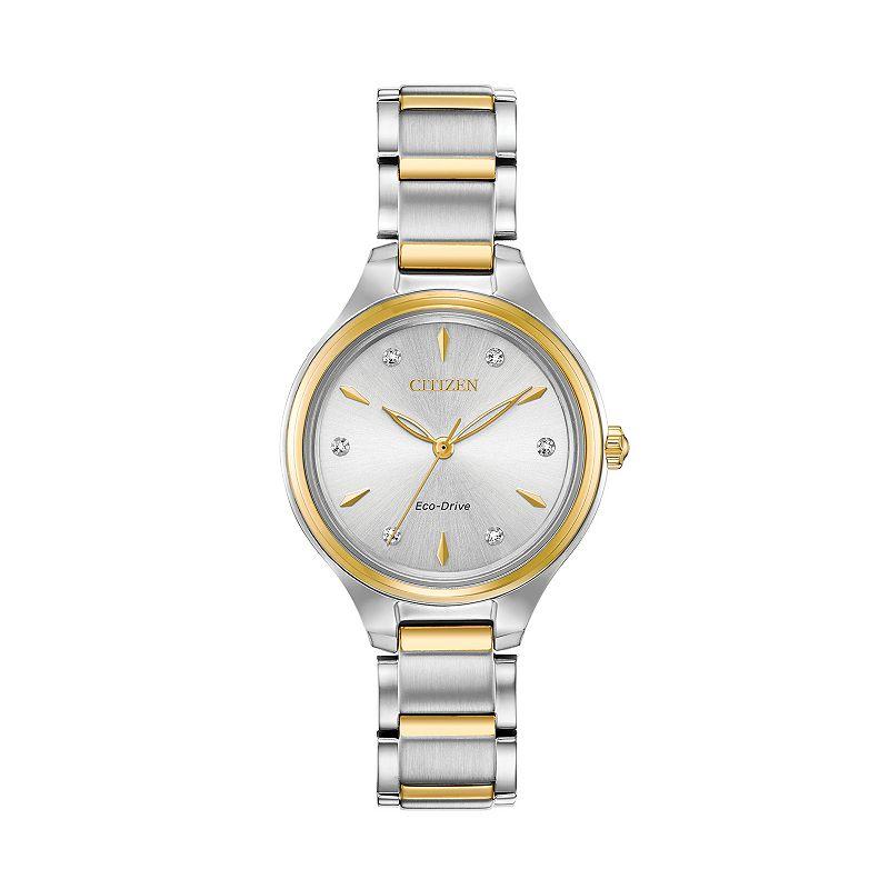 Contemporary Citizen Corso featured in two-tone stainless steel with a complimentary silver-white dial with diamond accents. Powered by Eco-Drive. The CITIZEN Corso collection offers a classic, contemporary style for the simple watch wearer. A functional simplicity with a touch of elegance. Featuring our Eco-Drive technology – powered by light, any light. Never needs a battery. | Citizen Two-Tone Stainless Steel Eco-Drive Corso Diamond-Accent Bracelet Watch