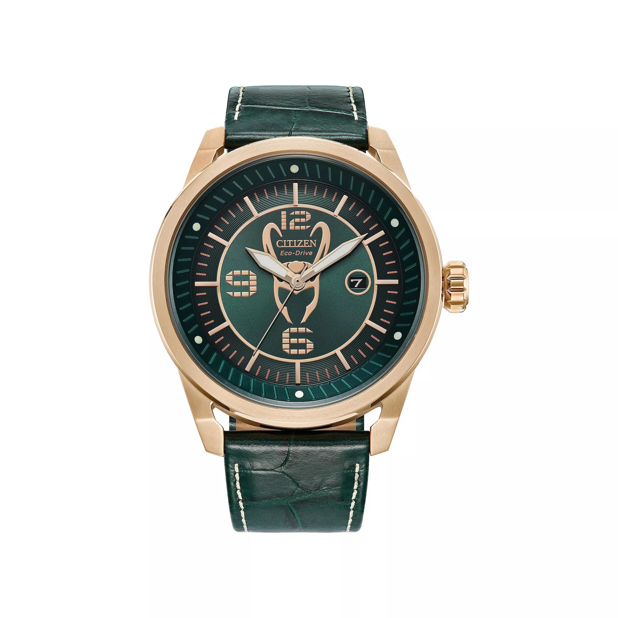 Marvel Studios’ Loki is here with the latest Marvel Studios timepiece from Citizen. This striking timepiece features a gold-tone stainless steel case, with faceted lugs connecting to a deep green crocodile-textured strap, and a case back featuring the Time Variance Authority icon. At the center of the 3-hand dial, a gold-tone Loki helmet graphic is bold against a deep green background, with the color of the horned helmet complemented by matching details in the scaled hour markers, date window, and periphery details. The sleek watch is powered by Citizen’s proprietary Eco-Drive technology - powered by any light, and never needs a battery. | Citizen Mens Marvel Loki Strap 45Mm, No Size