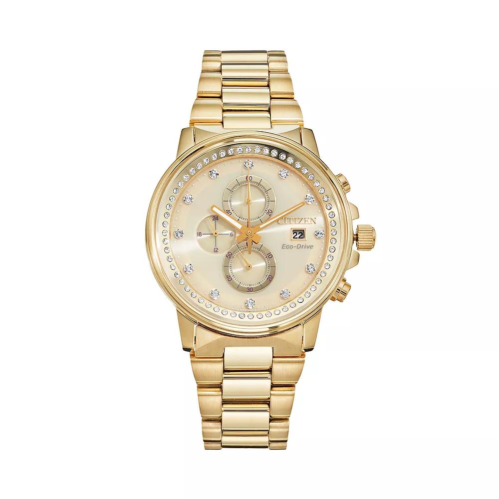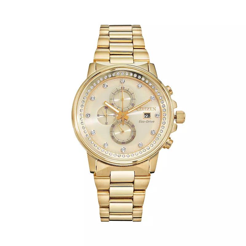 Stand-out style from Citizen. Keep time with this Eco-Drive watch outfitting your wrist, showcasing a sleek champagne dial and convenient chronograph from the Nighthawk collection.Watch the product video here.FEATURES Calendar: date Chronograph: measures up to 60 minutes in 1/5-second increments Water resistance: 200 meters CASE & DISPLAY Dial: champagne Luminescence: hands Face cover material: mineral crystal Case: gold-tone stainless steel Caseback: stainless steel Stones: crystal Diameter: 42 mm BAND Material: gold-tone stainless steel Clasp: fold-over pushbutton deployment DETAILS Movement: quartz Power: Eco-Drive Warranty: manufacturer's 5-year limited For warranty information please click here Model number: FB3002-53P A GUIDE FOR USING YOUR CITIZEN NIGHTHAWK WATCH Setting the time Pull the crown out to position two just as the second hand is at the reference position in order to accurately align to the second. Rotate the crown to move the minute hand ahead of the correct time by five minutes and then return the hand to the correct minutes. This will minimize gear play and will provide more accurate hand movement. Press the crown back into normal position. Setting the date Pull the crown out to position one. Rotate the crown counter-clockwise to set the date. The date will not change when the crown is rotated clockwise. Press the crown back into its normal position. Do not adjust the date between 9 p.m. and 1 a.m. If you change the date during this time, the date may not change the following day. The date must be manually adjusted for months shorter than 31 days. Using the chronograph To start the chronograph, press and release the upper right button to commence time measurement. To stop the chronograph, press and release the upper right button. To recommence timing from the stopped position, press and release the upper right button. To reset the chronograph after stopping time measurement, press and release the lower right button. Pressing and releasing the lower right button during chronograph operation will cause timing to stop and the chronograph to reset. Size: One Size. Gender: male. Age Group: adult.