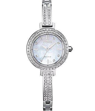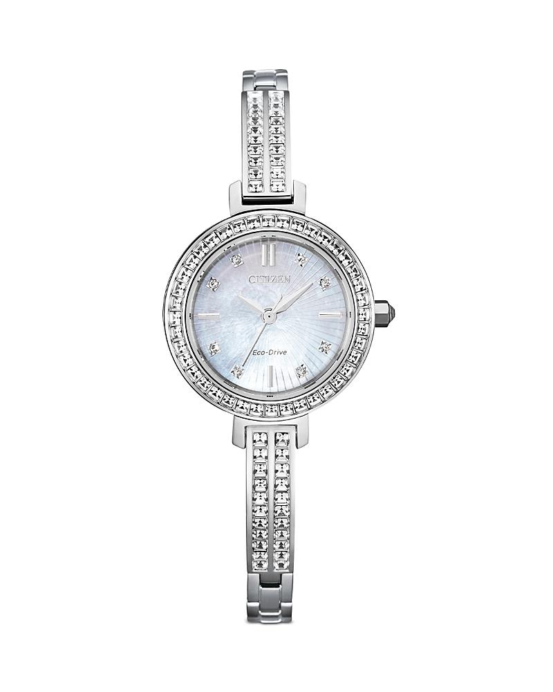 From Citizen, the Womens Silhouette Crystal Three Hand Stainless Steel Bracelet Watch features: Stainless steel case and braceletMineral crystal silver dialJewelry clasp with push buttons93 crystal accents on band, bezel, and dialThree-hand movementCase size approx. 25mm Water Resistance: 50 ATMImported.