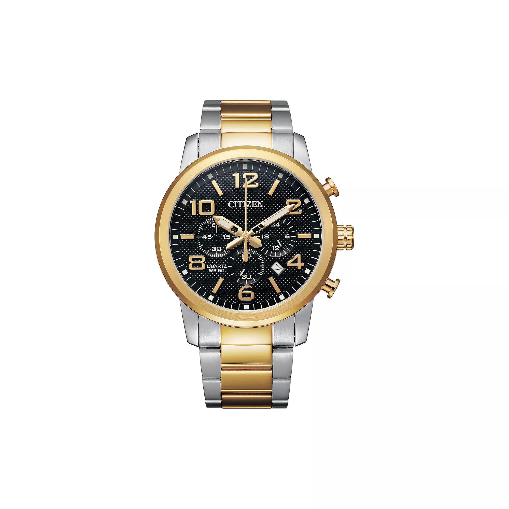 A two-tone stainless steel construction and chronograph functionality make this men's Citizen watch an impressive choice. A two-tone stainless steel construction and chronograph functionality make this men's Citizen watch an impressive choice. FEATURES Chronograph: measures 1-second increments for up to 60 minutes 12/24-hour formats Date windowCASE Material: stainless steel with gold-tone accents Dial color: black Face cover material: mineral crystal Diameter: 42 mmBAND Material: stainless steel with gold-tone accents Clasp: fold-over push-button deployment Circumference: 210 mm Width: 22 mmDETAILS Movement: quartz Power: battery Water resistance: 50 meters Packaging: boxed Warranty: manufacturer's 5-year limited For warranty information please click here Modified return policy applies. Size: Large. Color: Multicolor. Gender: male. Age Group: adult.