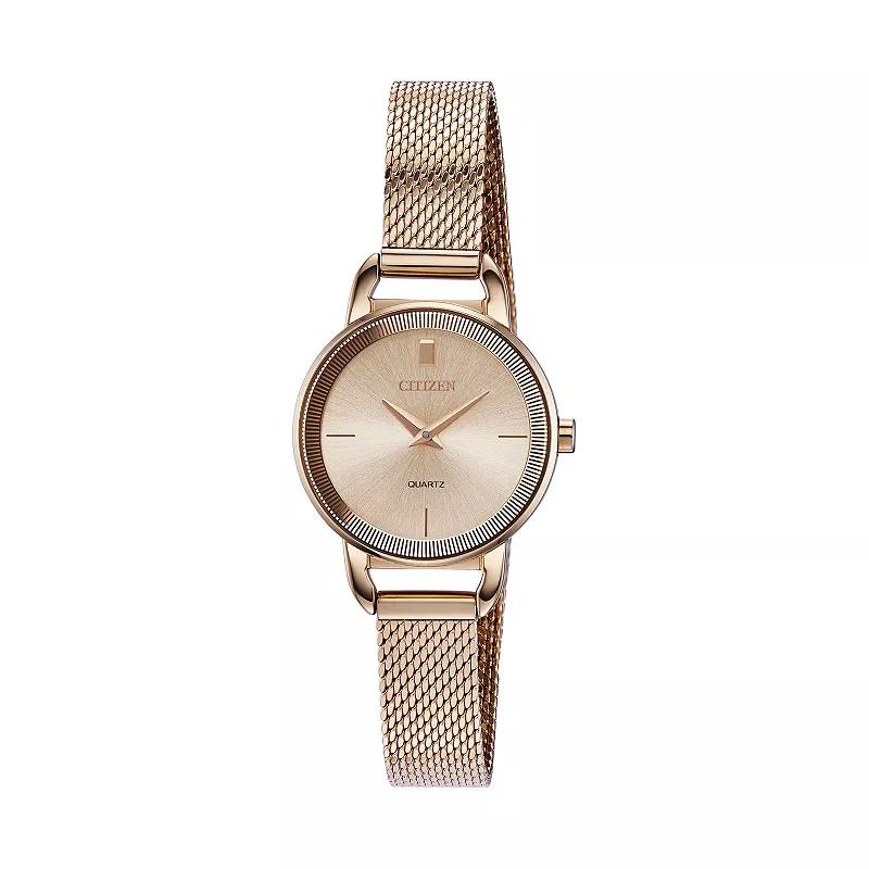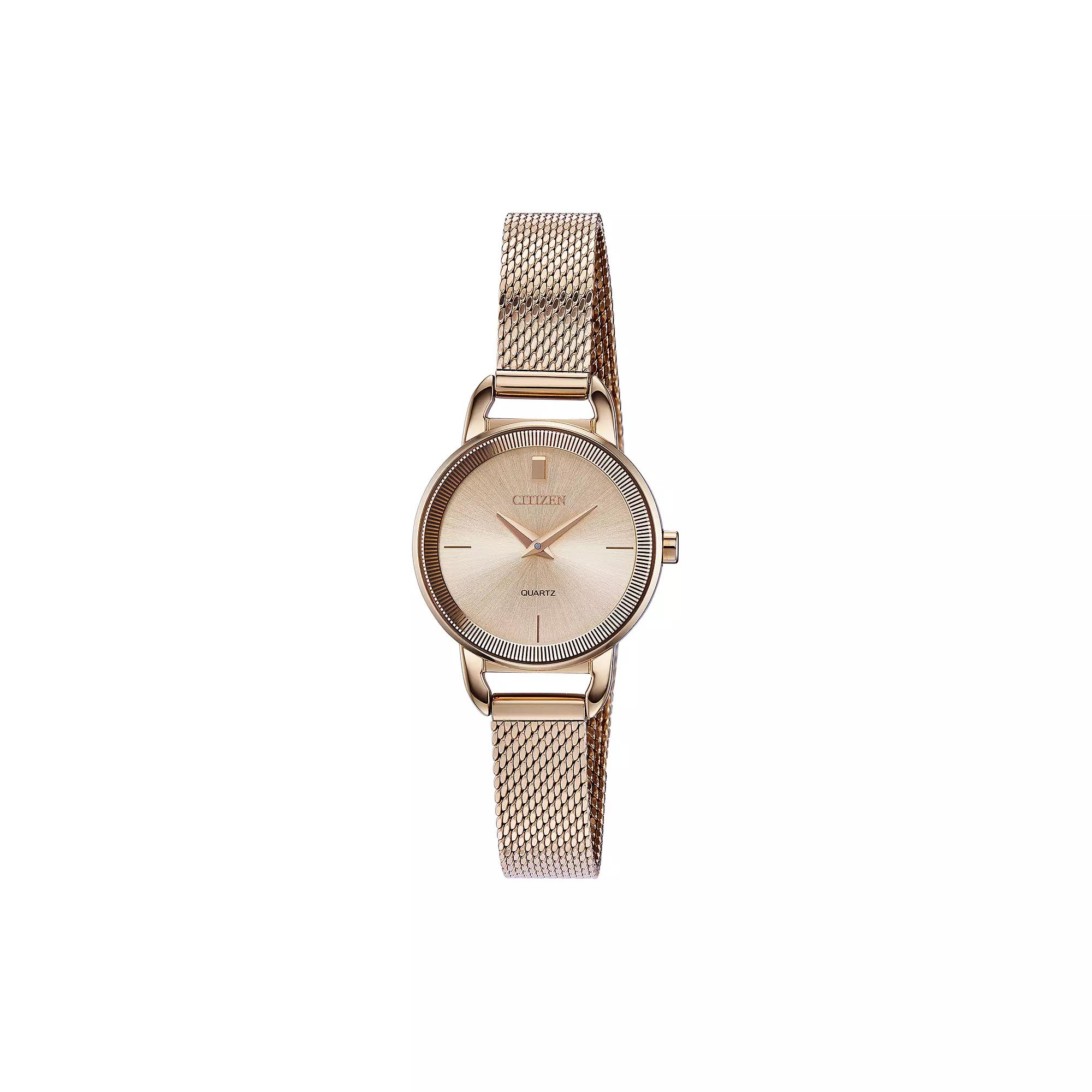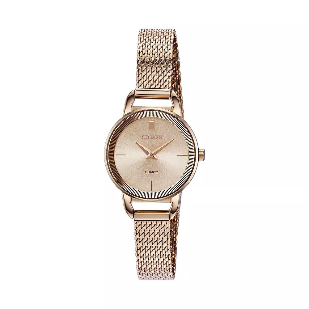 Enhance the look of any ensemble with the timeless sophistication of this women's Citizen watch. Enhance the look of any ensemble with the timeless sophistication of this women's Citizen watch. DISPLAY Dial color: rose gold tone Face cover material: mineral crystal CASE Material: rose gold-tone stainless steel BAND Circumference: 190 mm Clasp: sliding security DETAILS Movement: quartz Power: battery Water resistance: no rating Packaging: boxed Warranty: manufacturer's 5-year limited For warranty information please click here Gift Givers: This item ships in its original packaging. If intended as a gift, the packaging may reveal the contents. Size: Small. Color: Pink. Gender: female. Age Group: adult.