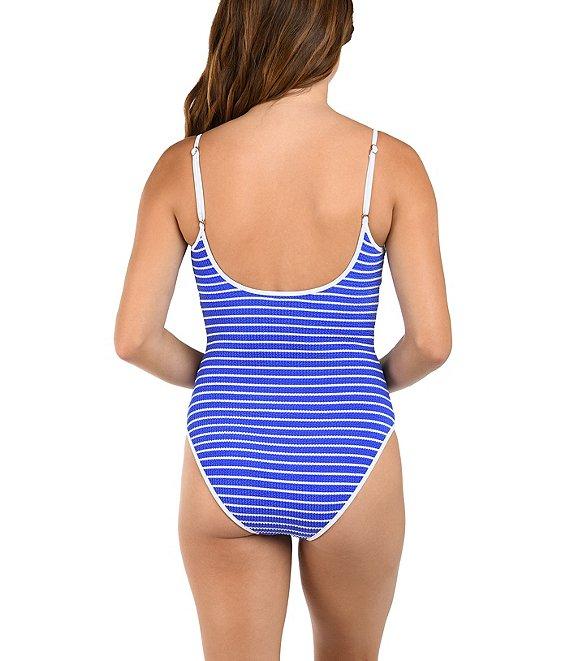 From Citrus, this one piece swimsuit features: Pucker silhouette Tank silhouette Stripe print Scoop neckline Removable padded cups Adjustable straps White pipping trim Moderate coverage Fully lined Pull-on construction Nylon/polyester/elastane Hand wash Imported.