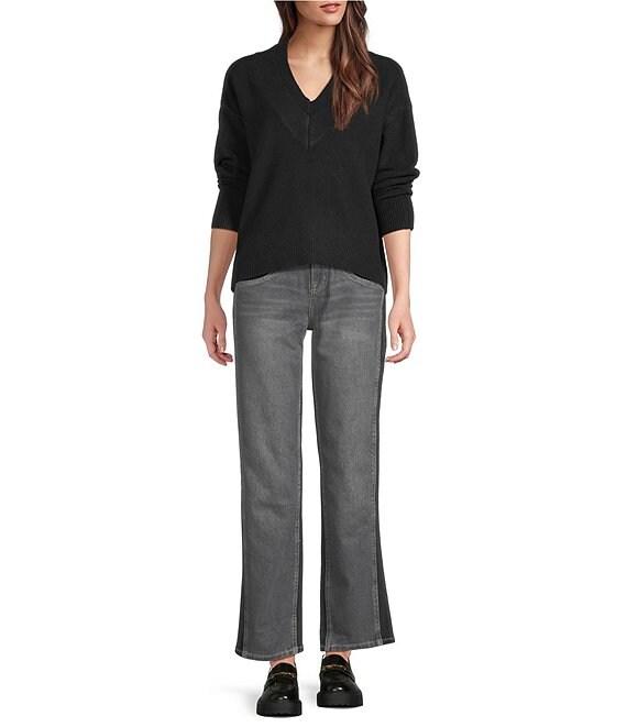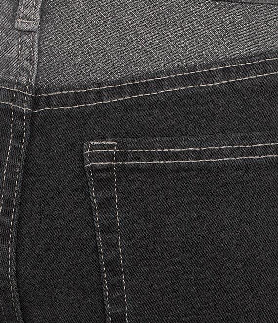From City Blues, these jeans feature: Two-tone denim fabrication Straight leg Belt loops 5-pocket styling Clean hem Button front/zip fly closure Approx. 28.5" inseam, 16" leg opening,10.75" front, back rise 15" Self: cotton/polyester/spandex; contrast: cotton/polyester/rayon/spandex Machine wash Imported.