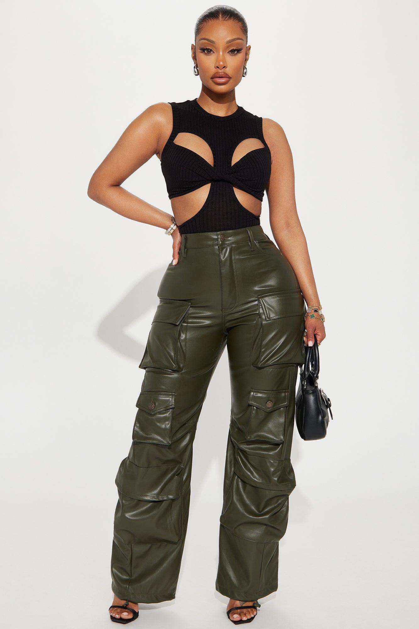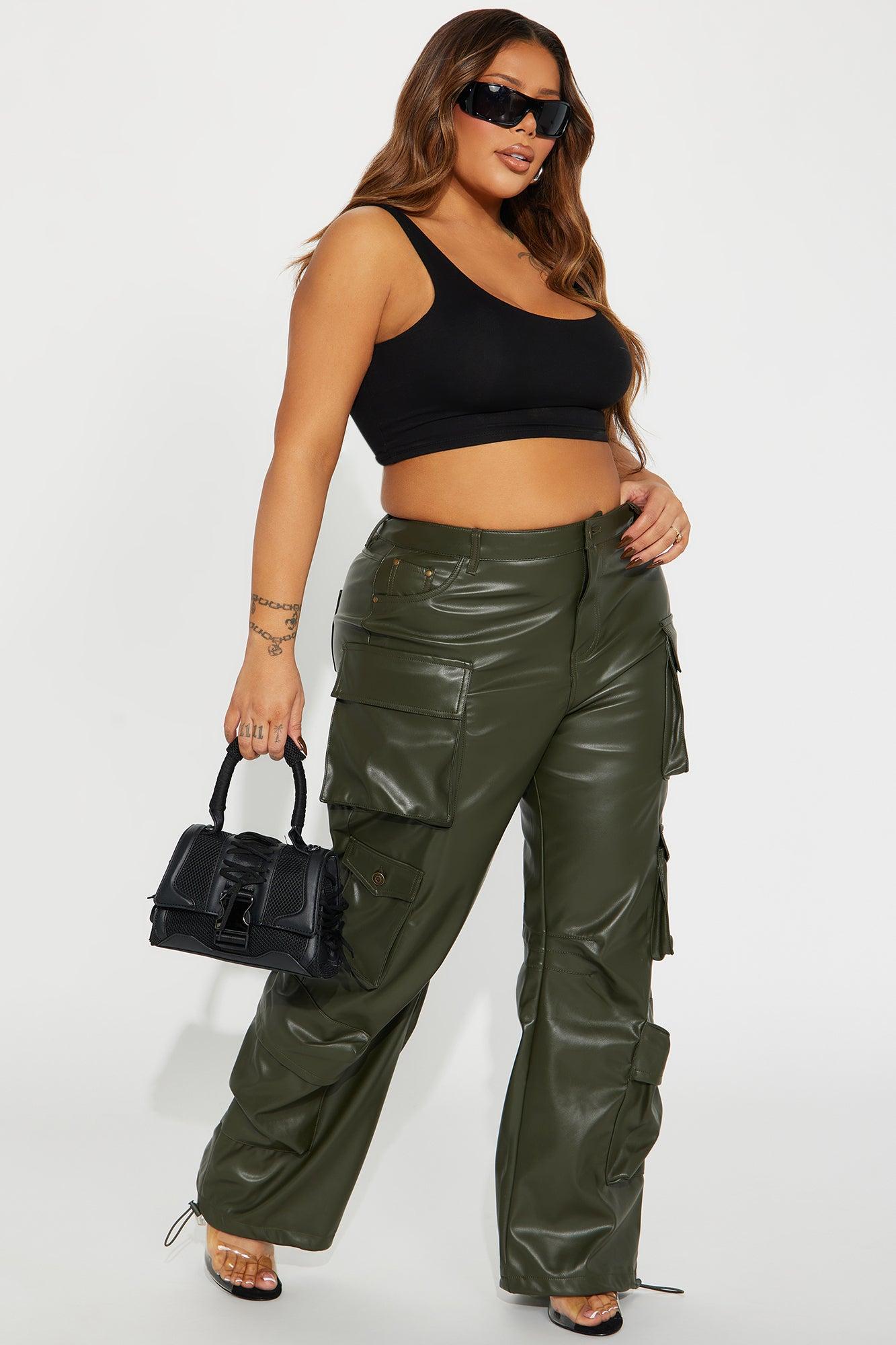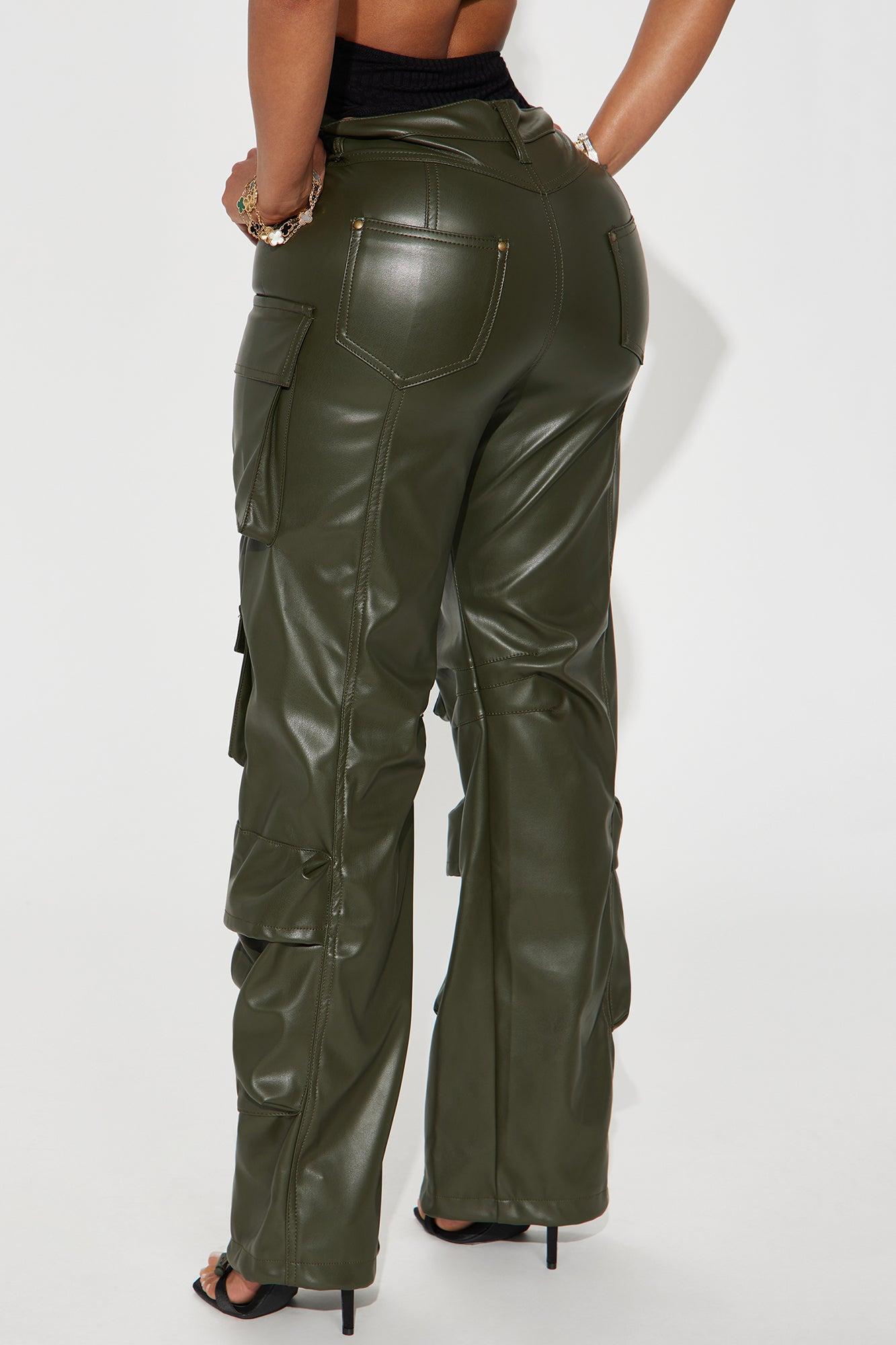 Available In Olive And Silver. Cargo Pant High Rise Button Zipper Closure Cargo Pockets Bungee Ankles Faux Leather Stretch 100% PU Imported
