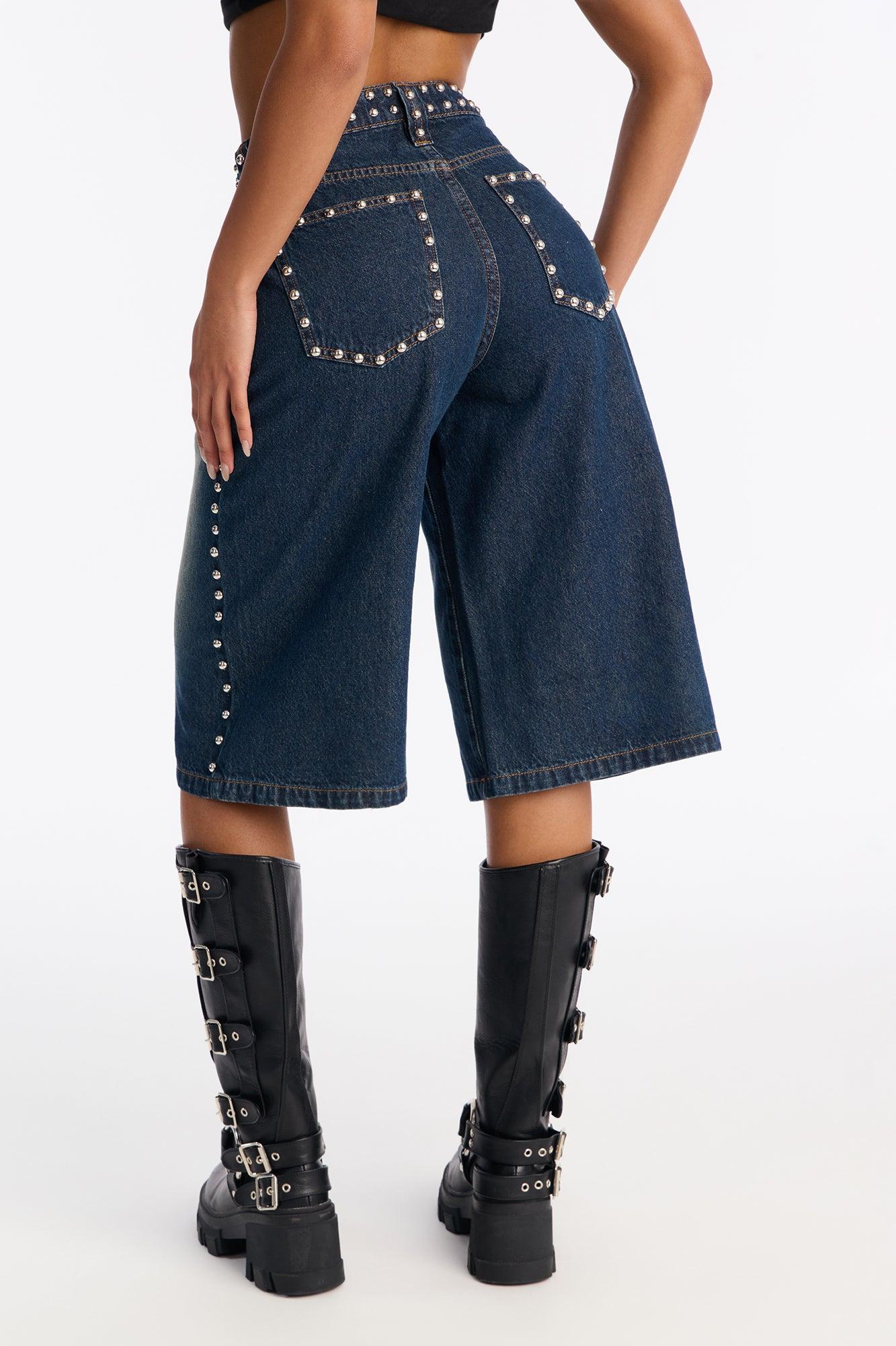 Available In Vintage Wash. Denim Jort 5 Pocket Studded Raw Hem 11.5" Rise 15.5" Inseam Non-Stretch Disclaimer: Due To The Specialized Wash, Each Garment Is Unique. 100% Cotton Imported California Proposition 65WARNING: Cancer and Reproductive Harm - www.P65Warnings.ca.gov.