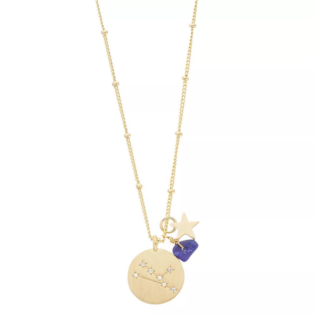 Add a personalized touch to your look with this City Luxe gold tone horoscope cubic zirconia disk and simulated gemstone charm necklace Add a personalized touch to your look with this City Luxe gold tone horoscope cubic zirconia disk and simulated gemstone charm necklace Pendant size: 20 mm L X 15.7 mm W Chain length: 16 in. with 2 in. extender Chain type: bead Clasp: lobster claw Metal: brass Plating: gold tone Finish: matte Packaging: boxedSTONE DETAILS Center stone size: 1.2 mm Stone type: cubic zirconia Shape: bead, shape: round Setting: glue, epoxy Color: Blue. Gender: female. Age Group: adult.