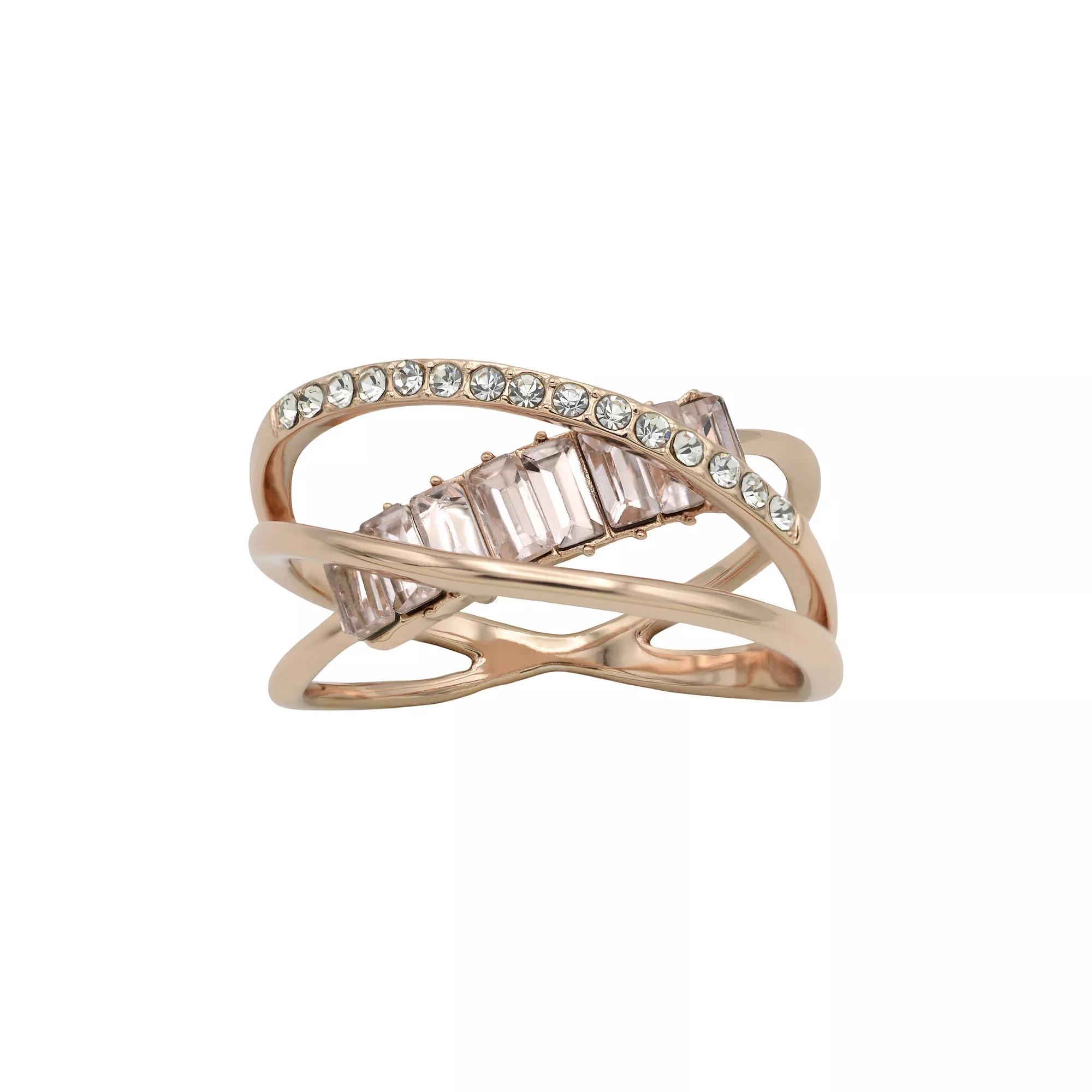 Make your outfit perfect with these City Luxe rose gold tone crystal crossover ring. Click on this JEWELRY & WATCHES GUIDE to learn about fit, styles, materials and more! Make your outfit perfect with these City Luxe rose gold tone crystal crossover ring. Click on this JEWELRY & WATCHES GUIDE to learn about fit, styles, materials and more! FEATURES Ring width: 10 mm Shank style: split Band fit: flat Nickel free Metal: brass Plating: rose gold tone Finish: polished Packaging: boxed ImportedSTONE DETAILS Stone type: crystal Center stone size: 2 mm x 4 mm Shape: baguette cut and round Setting: glue/epoxy Gemstones may have been treated to enhance their appearance. Special care may be required. Please visit our Gemstone Treatment & Special Care Guide for more information. Color: Rose Tone. Gender: female. Age Group: adult.