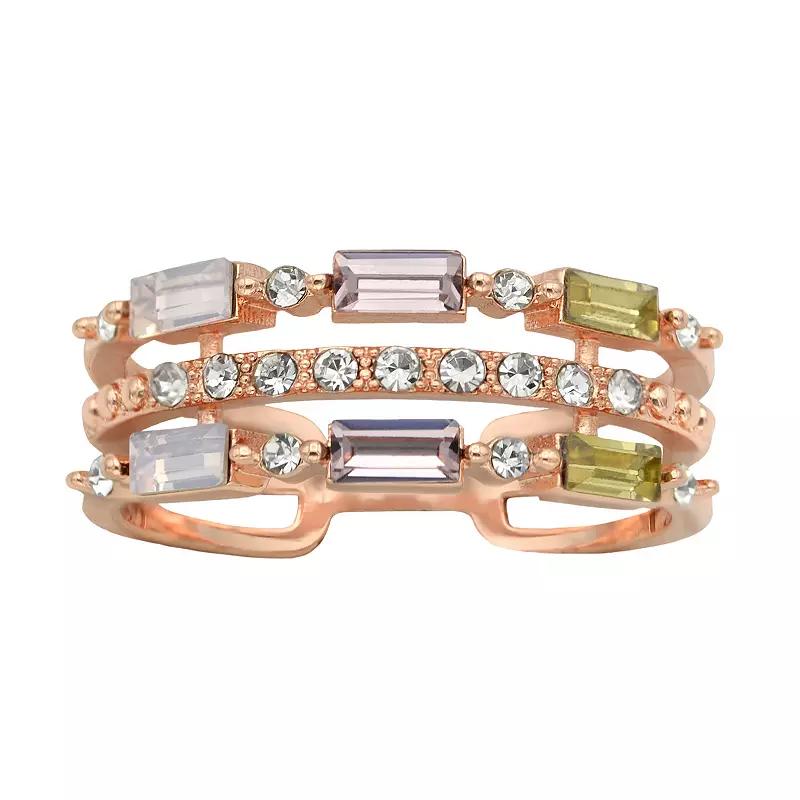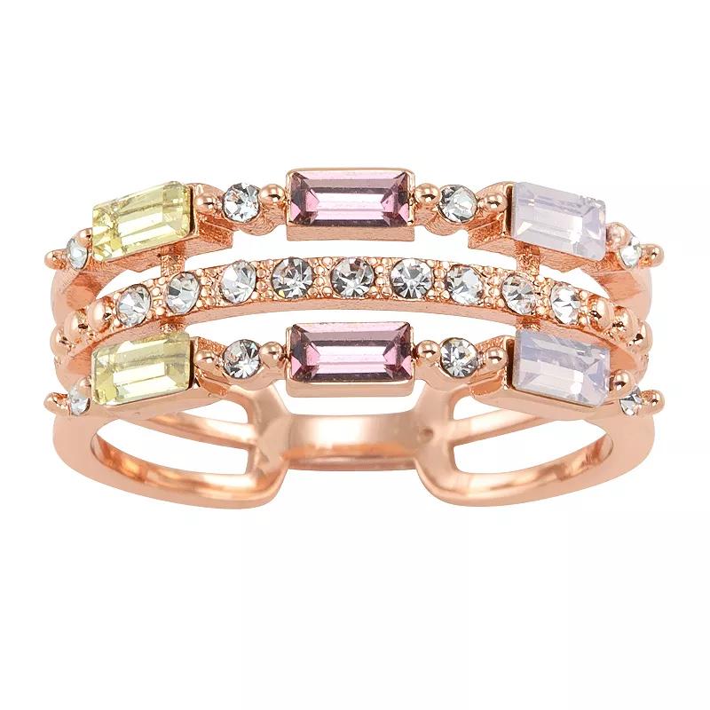This City Luxe rose gold tone ring brings the bling with a faux stack band design and gorgeous crystal stones. Click on this JEWELRY & WATCHES GUIDE to learn about fit, styles, materials and more! This City Luxe rose gold tone ring brings the bling with a faux stack band design and gorgeous crystal stones. Click on this JEWELRY & WATCHES GUIDE to learn about fit, styles, materials and more! FEATURES Width: 8 mm Shank style: tapered Band fit: flat Nickel free Metal: brass Plating: rose gold tone Finish: polished Packaging: boxed ImportedSTONE DETAILS Stone type: crystal Total weight: 9.0 ct. Shape: baguette cut, round Size: 7. Color: Multicolor. Gender: female. Age Group: adult.