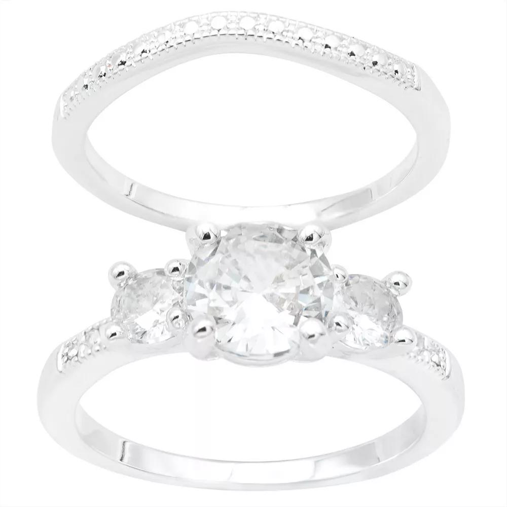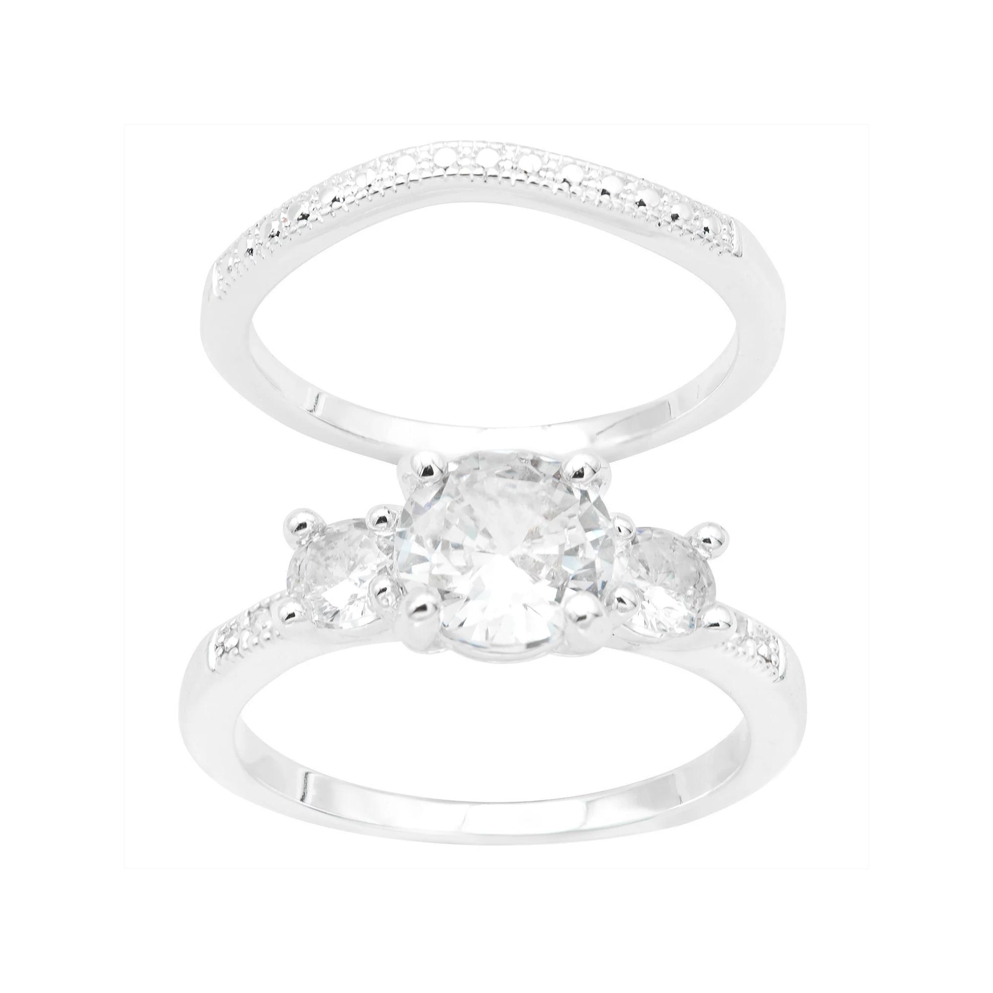 This City Luxe cubic zirconia duo engagement ring set if a beautiful symbol of love. Click on this JEWELRY & WATCHES GUIDE to learn about fit, styles, materials and more! - https://www.kohls.com/feature/jewelry-guide.jsp. FEATURES: Width: 5.0 mm, Shank style: stackable, Band fit: flat, Metal: brass, Plating: silver tone, Finish: polished, Packaging: boxed, Includes: 2 rings, Nickel free. STONE DETAILS: Stone type: cubic zirconia, Total weight: 2.11 ct., Center stone weight: 2.9 ct., Center stone size: 7.0 mm, Shape: round, Setting: prong. Gemstones may have been treated to enhance their appearance. Special care may be required. Please visit our. Gemstone Treatment & Special Care Guide. - https://www.kohls.com/sale-event/gemstone-care-product-guide.shtml for more information. Color: Silver Tone Clear. Gender: female. Age Group: adult. Material: PLATED BRASS.